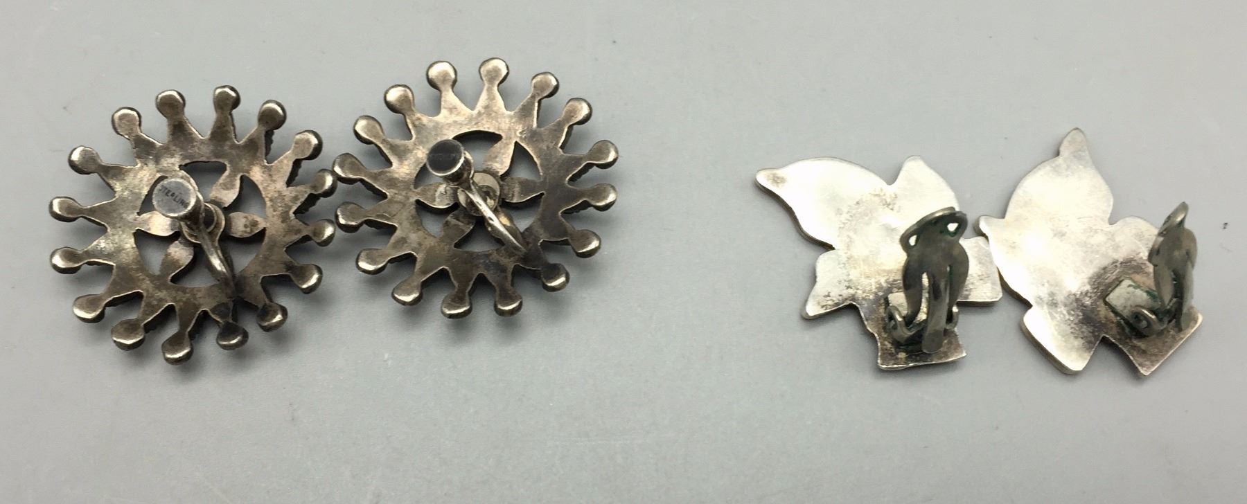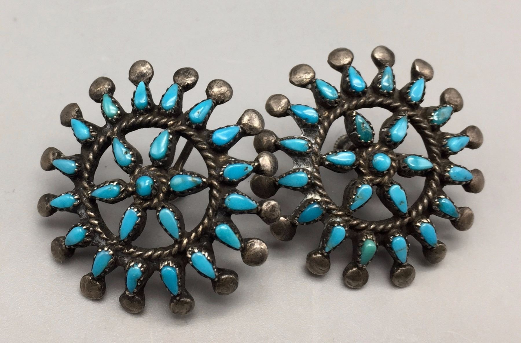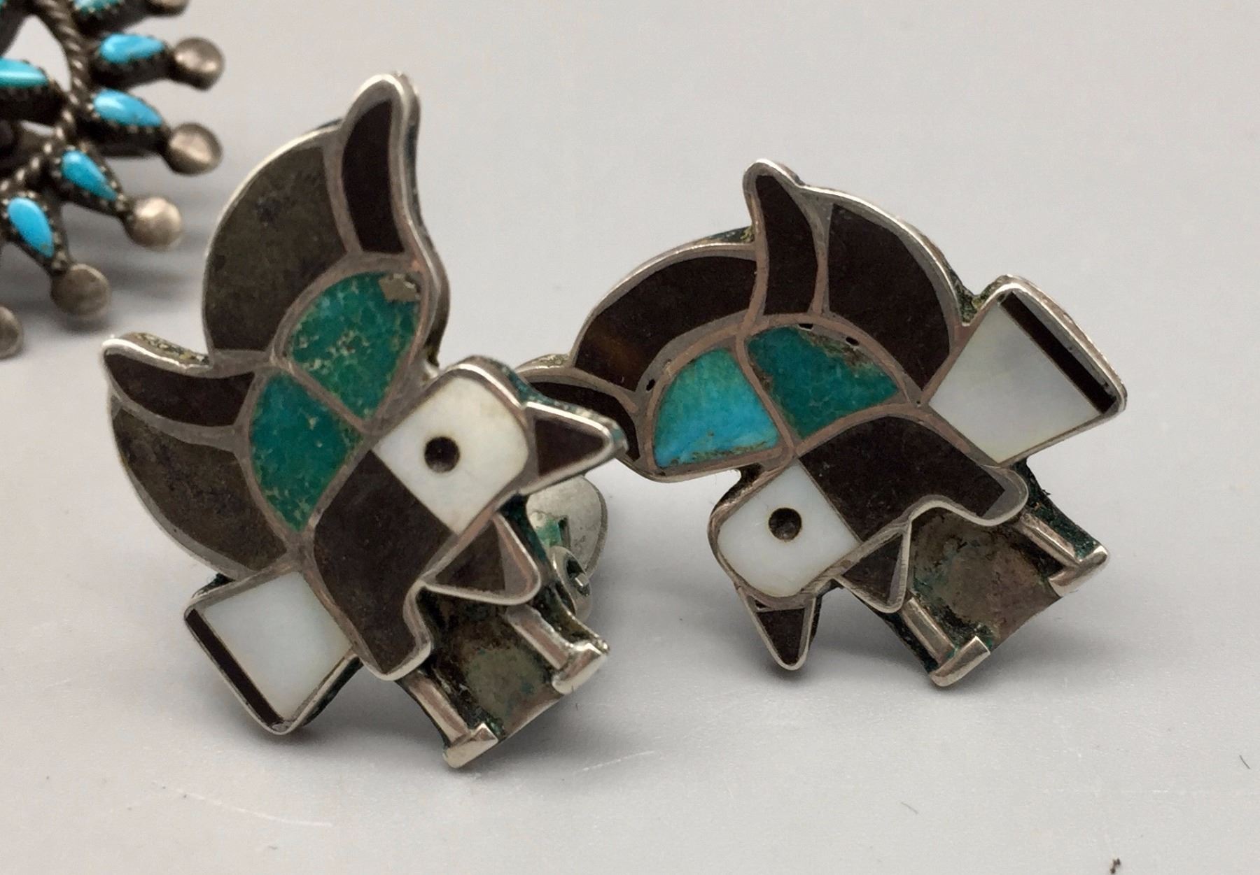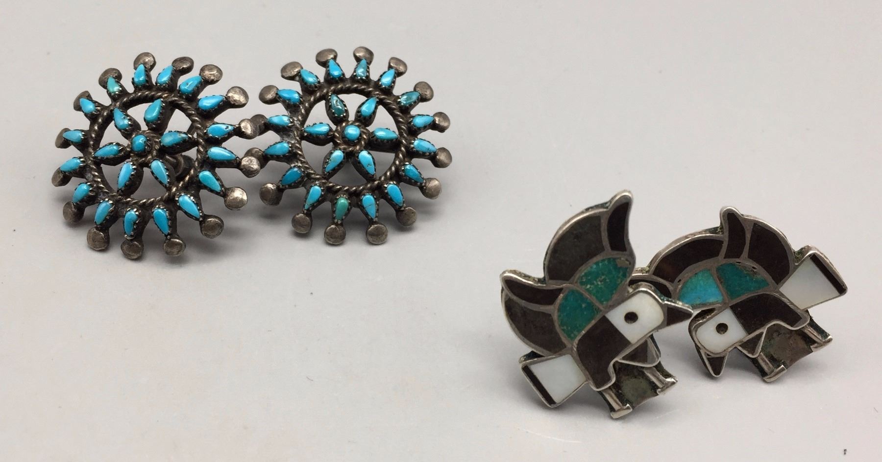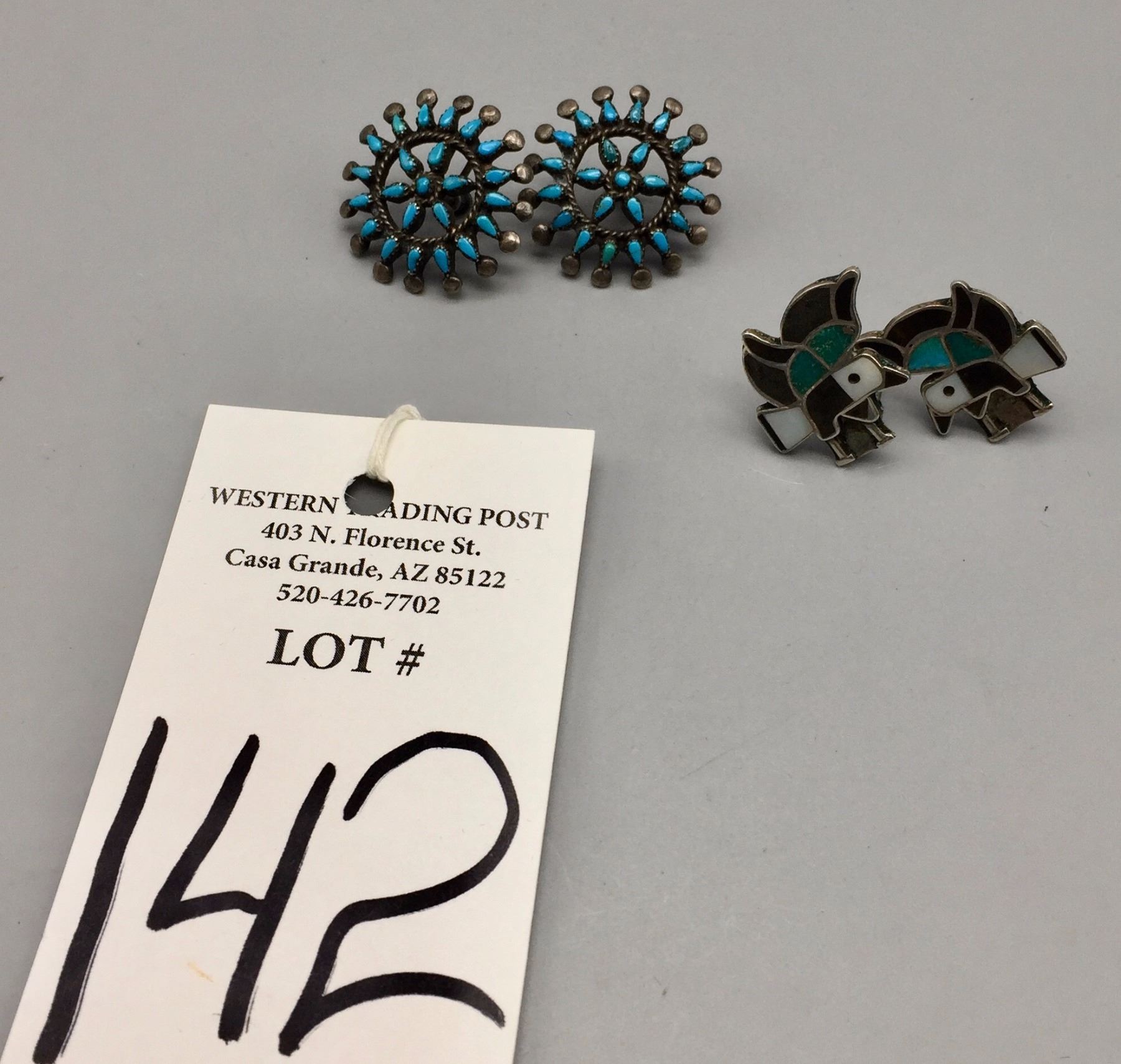 Maker: Unmarked, Zuni made. Approx. Age: Circa mid-century. Size: 1) 1 1/8” in circumference 2) About 7/8” tall Additional Info: 1) Turquoise Petit Point screw-on earrings 2) Turquoise, onyx and mother of pearl clip-on earrings. Condition: Good for their age, normal wear expected. Please look closely at the pictures - they are an important part of our description. Shipping: There will be a $5 handling / packaging fee for shipping this lot. The actual cost of postage will be added on top of that.