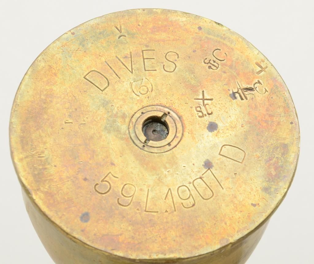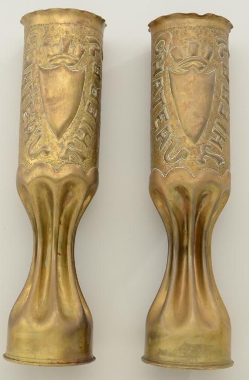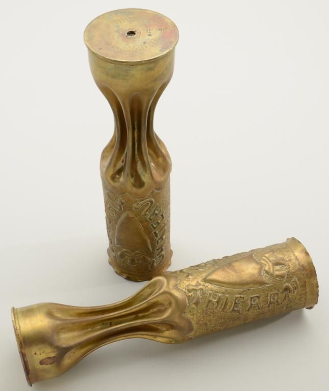 Pair of WW I era “trench art” consisting of two brass cannon shells that have been crimped at the base and decorated with the words “Chateau Thierry” and a crown and shield in relief, both in overall goodcondition; both approx. 13” in height with markings on the base of each shell including the date on one of 1907; a nice WW I battle collectible. Est.: $50-$100.