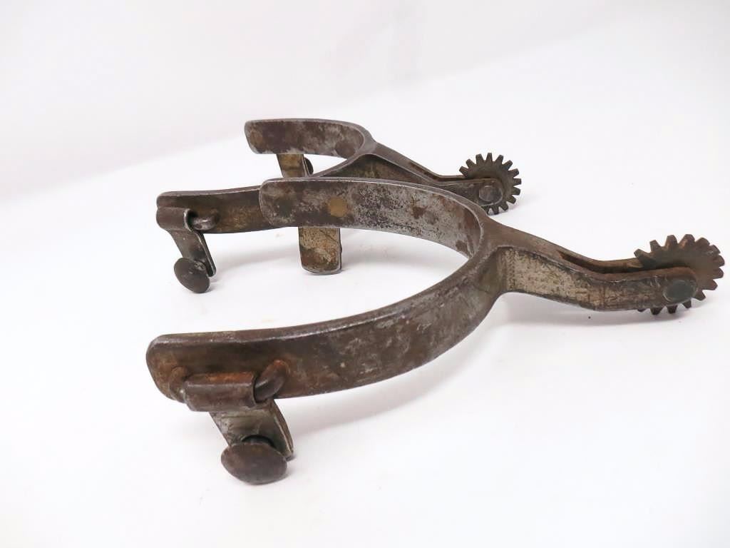 Engraved outer bands, 1" rowels, swinging buttons, Traces of nickel plating. Unmarked.