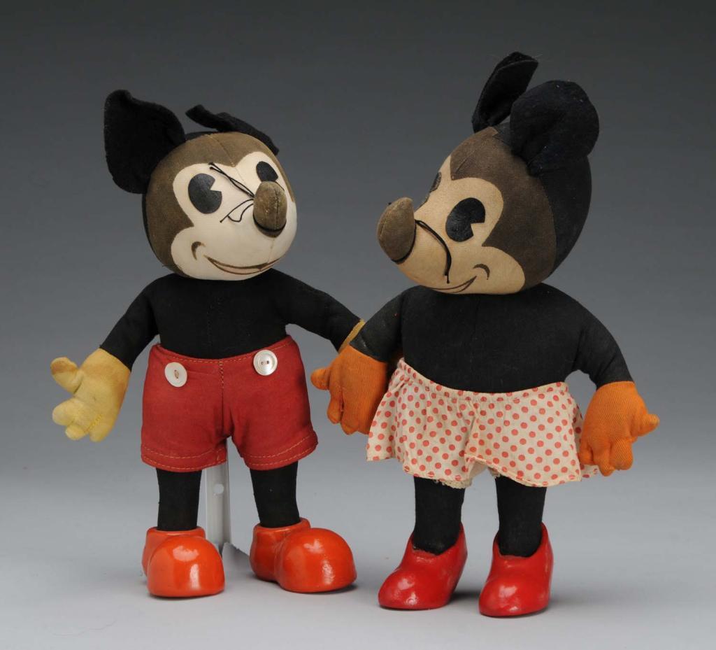 Unmarked. Both are Knickerbocker character dolls. Cloth-covered with composition shoes and original clothing. Some soiling and fading throughout both dolls. Condition (Very Good). Size Both: 12" T.