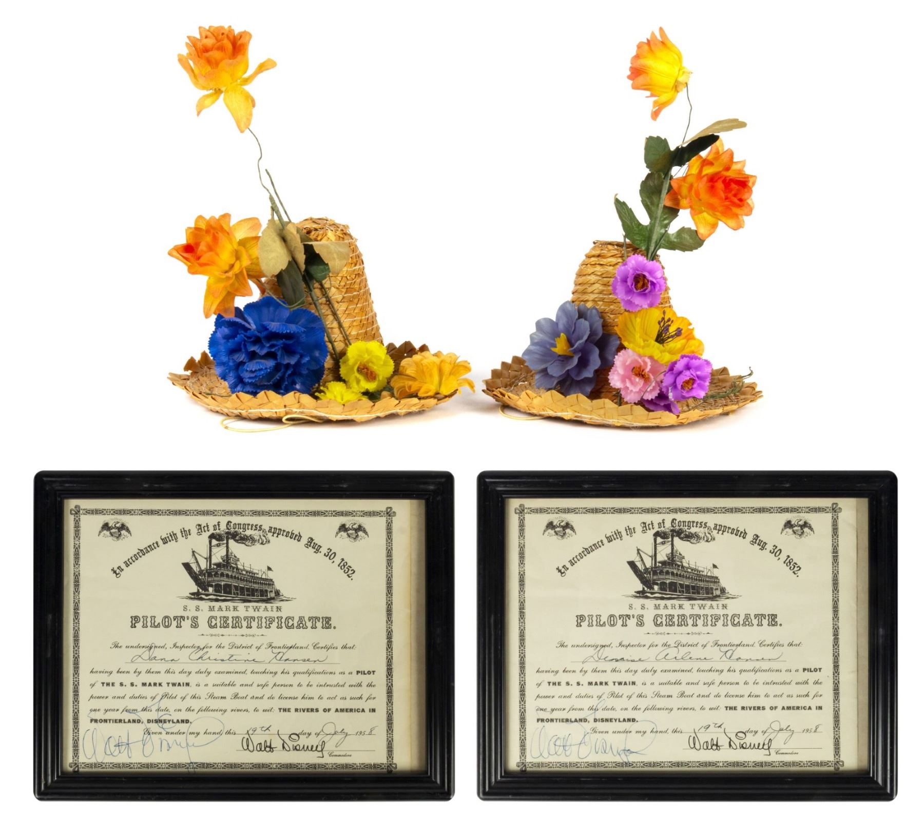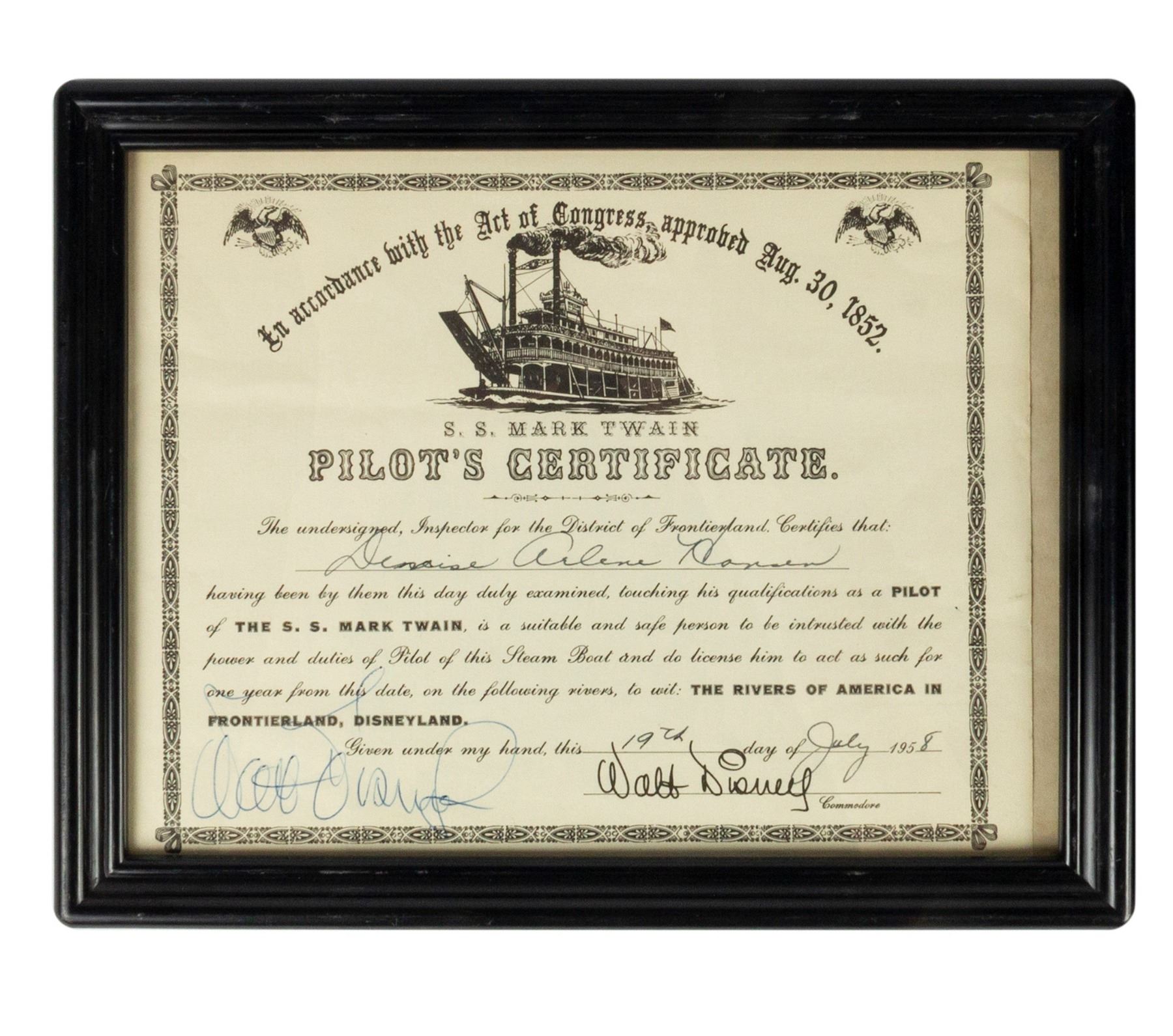 (Disneyland 1958) During the 1950s and 1960s, it was not uncommon to find Walt Disney walking through his park. It was well-known that Walt loved Disneyland, and loved seeing his guests enjoy the fruits of his labor. Such was the occasion on July 19, 1958, for twin 8 year old sisters Dana and Denise Hansen. The sisters had just disembarked from the Mark Twain, after being chosen to pilot the paddle wheeler around the Rivers of America. As they stepped off the dock, with their official Mark Twain pilot certificates in hand, they spotted a familiar figure standing off to the side of the dock, enjoying the view of the park. It was Walt Disney himself. Without a moment’s hesitation, the two sisters approached the most famous man in America and were greeted with a warm smile and embrace. Walt Disney loved to welcome his guests, and was always ready with a blue ball point pen to sign autographs. Today was no exception. Walt greeted the girls, commented on their matching straw hats, and asked if they were enjoying the park. With only their pilot certificates in hand, the girls offered them to Walt for his autograph and he happily obliged. It happened in an instant, but it was a moment they would never forget. Now, 60 years later, those matching signed certificates, as well as the matching hats they wore that day, are going to pass from one generation of Disney fans to a newer generation. These two certificates, one filled out for each of the girls, contain a beautiful Walt Disney original signature in the lower-left corner in blue ink. Both certificates measure approximately 7"x8.5" and come in small plastic frames, as displayed by the sisters. The original certificates, as well as the hats the girls were wearing, have minor wear from use and age.