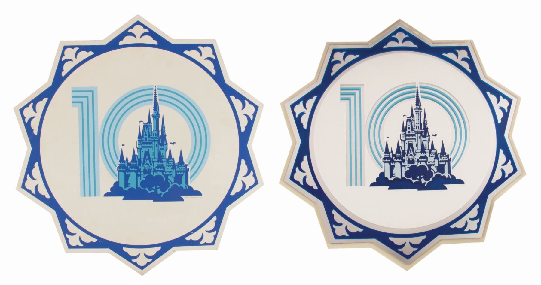 (Walt Disney World, 1981) A beautiful pair of Walt Disney World 10th anniversary signs. Each sign features Cinderella Castle and the 10th anniversary logo. Both signs are printed on acrylic board, and one has mirrored elements incorporated into its design. Both signs measure 20" in diameter, and the pair is in good condition with slight discoloration and wear from use.