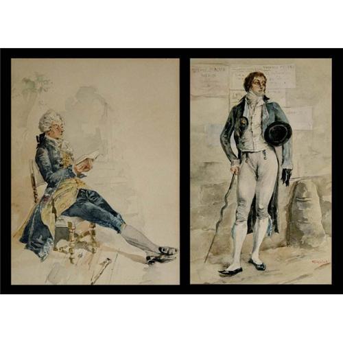 Pair of fine watercolors depicting Les Incroyables, dandies of the Directoire period (1795-99). In terms of fashion, Directoire is a transitional style between Louis XVI and Empire noted for distancing itself from the luxuries of the monarchy. A good example were the gnarled stick canes or "cannes torsadées" that replaced the precious canes of the old regime. Both watercolors are signed G. Galat (one in red and the other faded). In good used condition as shown. Please ask questions, request additional photos and shipping costs before buying.