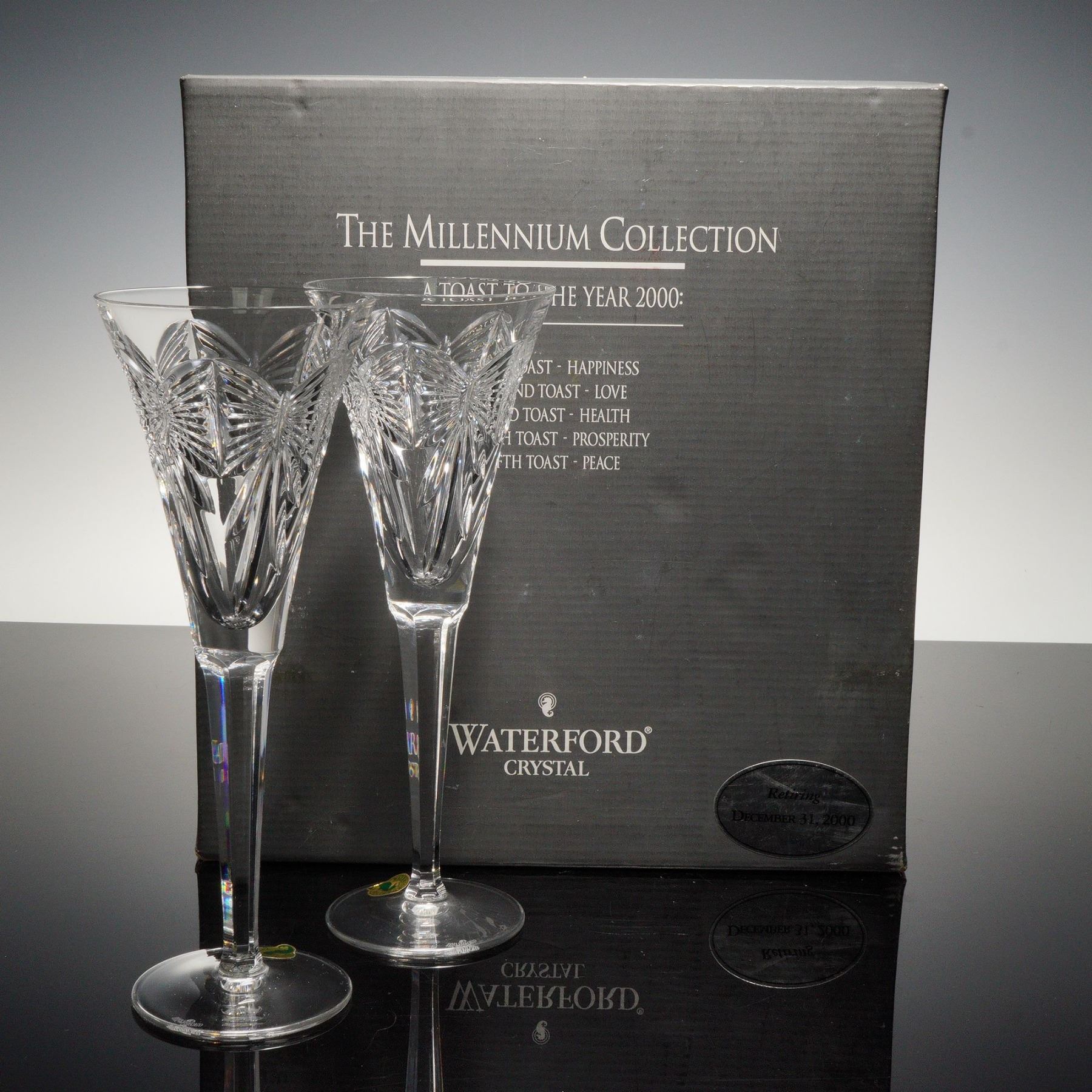 Pair of Waterford Crystal Millennium First Toast Flutes, Happiness