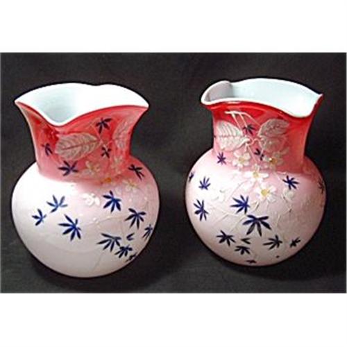 I have a pair of Peachblow vases made by Webb. Ca. 1885. Identification and color check made by using ""Peachblow glass"" by Billings. Each vase measures 8"" tall. The color shades from a deep rose to rose pink. Creamy white interior. The finish is glossy. All hand enameling work is in tact and is beautifully done. About 6 1/2"" at its widest and 5"" across at the top. No damage to either vase. Large polish pontils and each is numbered.