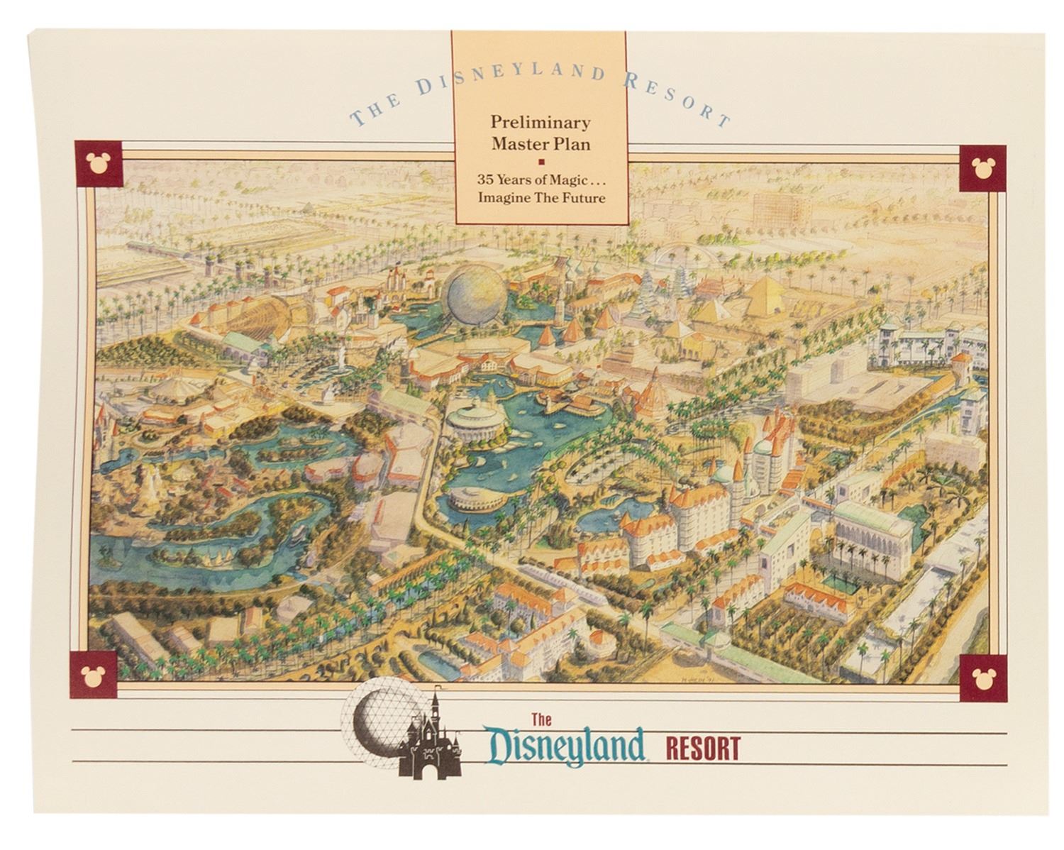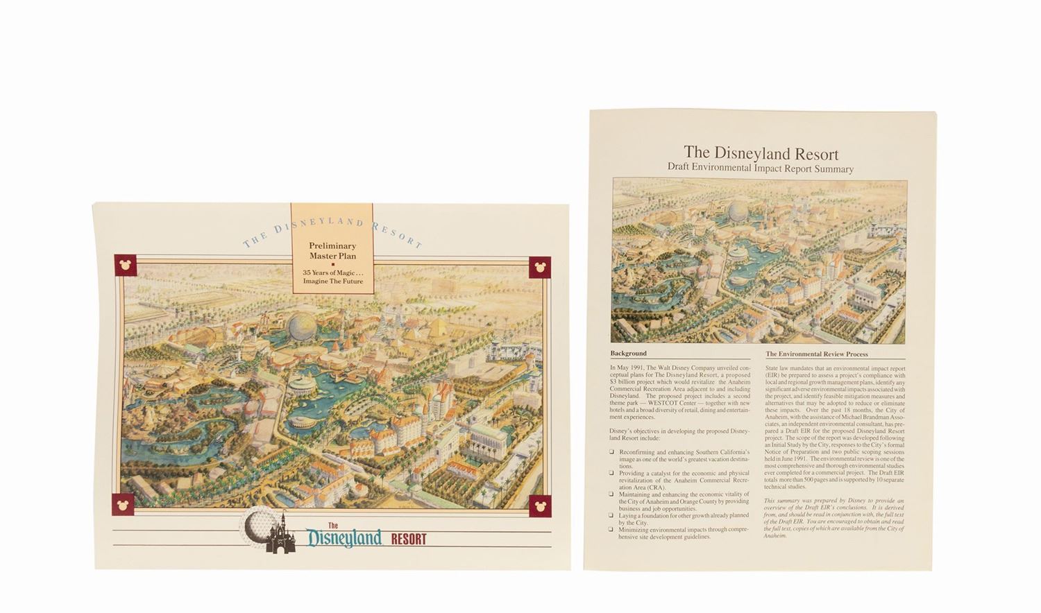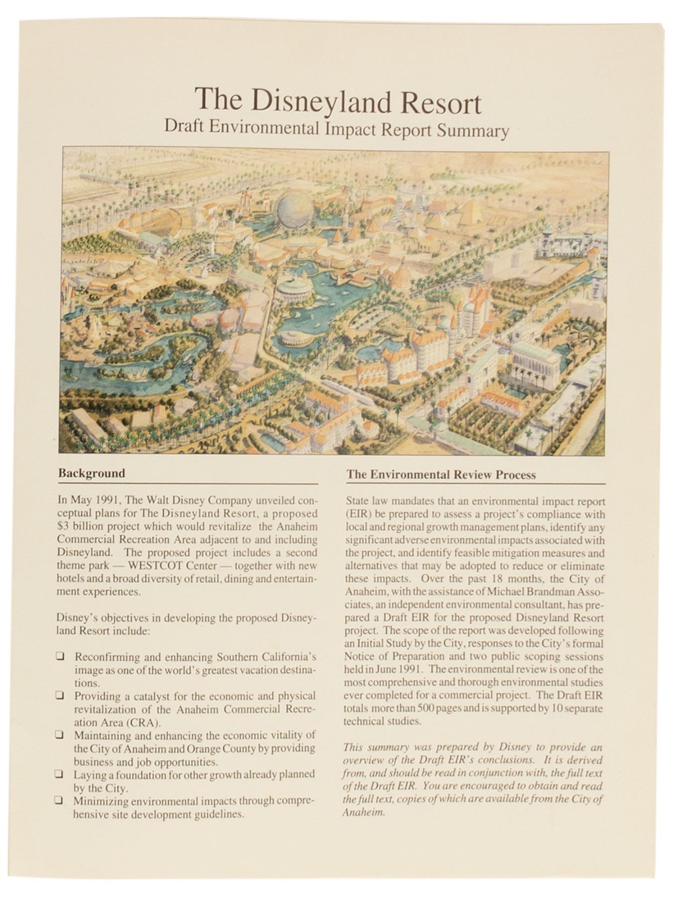 (Disneyland, 1990) A pair of promotional foldouts distributed by Disneyland to explain their plans for expansion of the resort and how it would impact the surrounding area. Prior to developing California Adventure, plans were created for an EPCOT-style resort near Disneyland, and the preliminary master plan foldout discusses that proposal. The draft environmental impact foldout report details how the new resort will affect the environment and nearby communities. Both foldouts measure 11”x8.5” folded and are in good condition with some curving to the paper from use.
