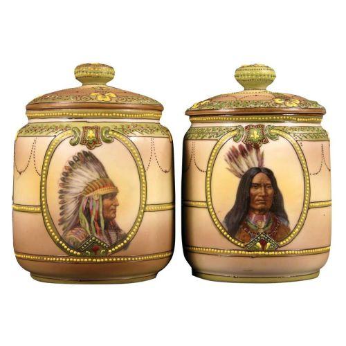 Pair of Nippon humidors both depicting Native American Indians. No chips or cracks, excellent condition. 3 1/2 diameter X 5 3/4 inches tall.