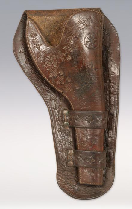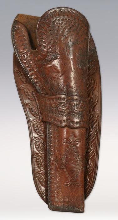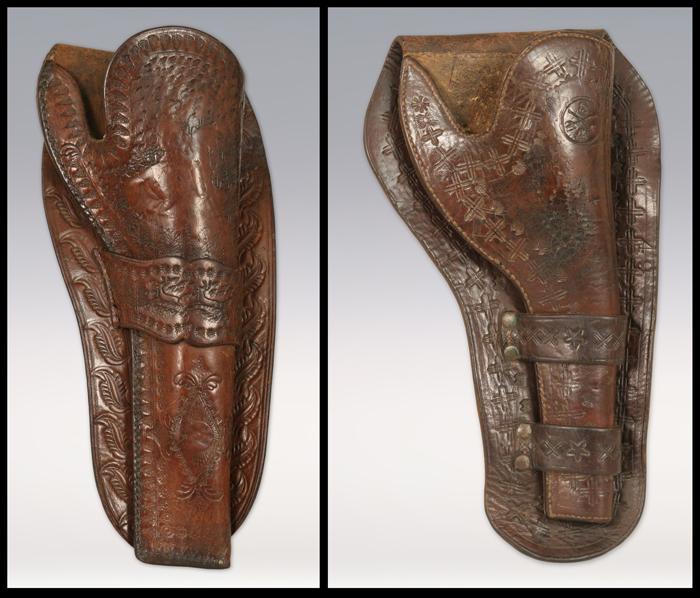 Pair of Western Tooled Holsters. (1) 12” long. Fits 7 ½” Colt single action revolver. Features tooled cowboy on horseback and deer, trees and other designs. Single loop Mexican style design. (2) 11” long. Fits 1902 Colt .38 double action service revolver. This was custom made by a Cavalryman on the Mexican border. 3rd Cavalry A Troop markings on body of holster along with various other tooling. Condition Report: Both in excellent condition.