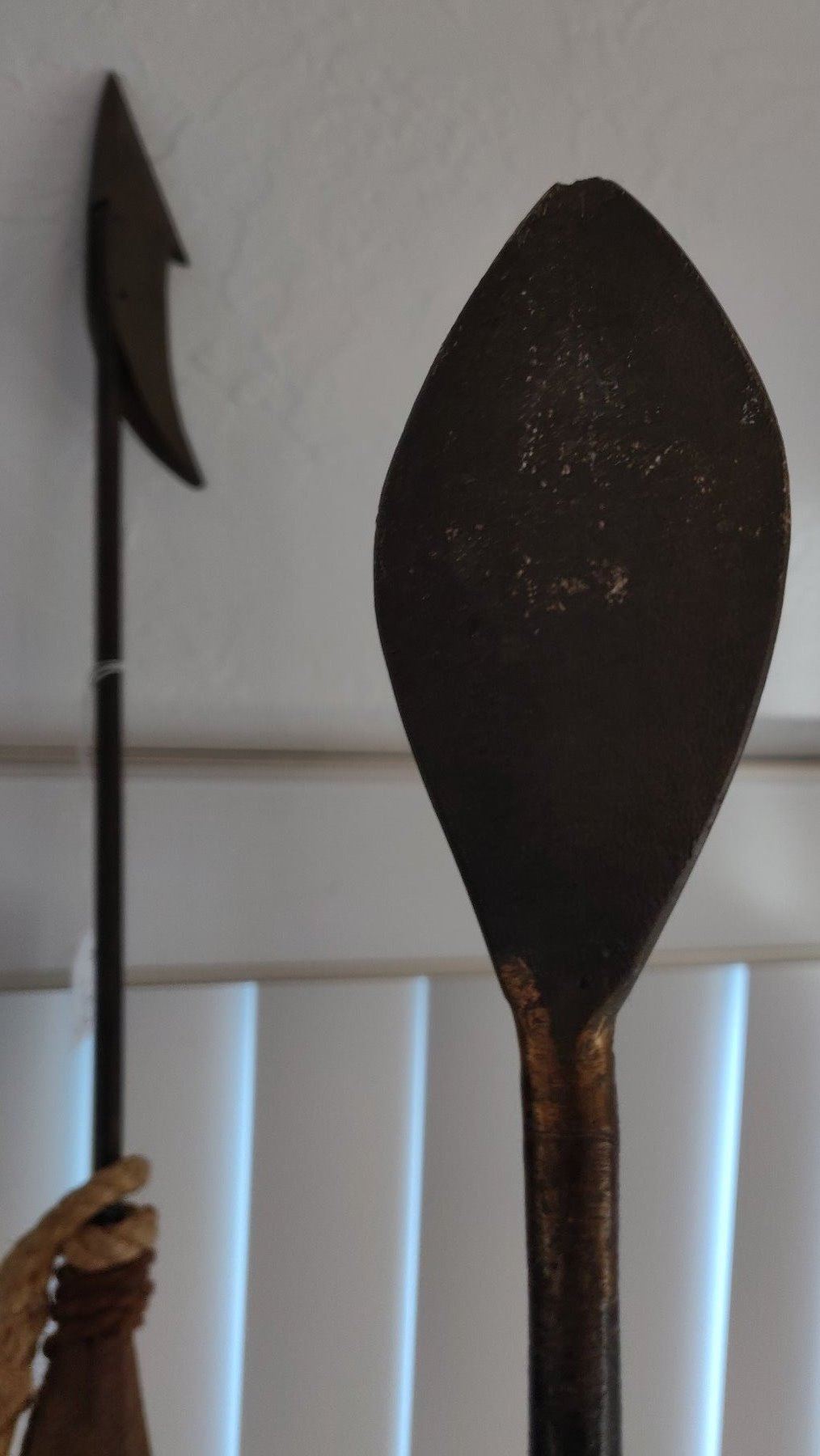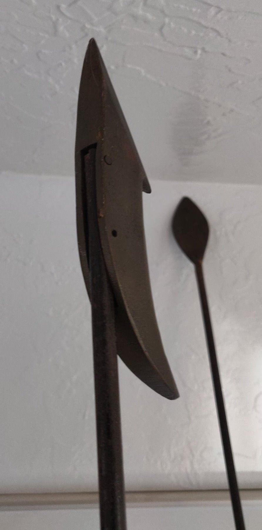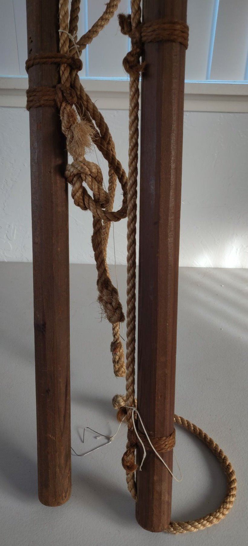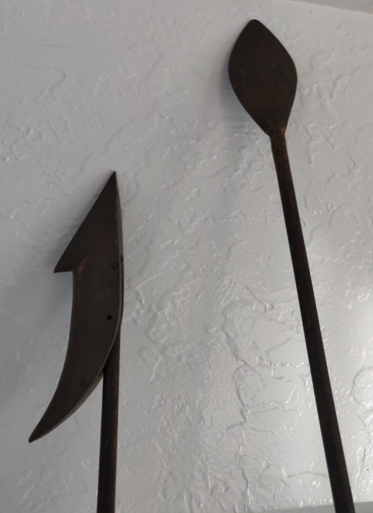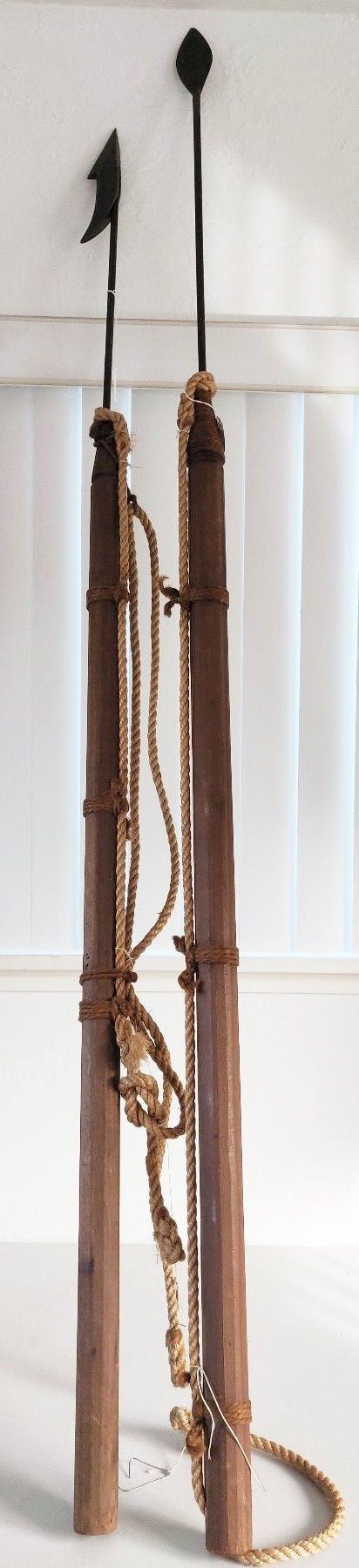 Pair of Whale Harpoons, c. 1920s. Made of steel, rope, brass and wood, the items measure 65" and 70" long. USA. Poles have been shortened for display. Condition: Good, see images. Shipping: $150.00 USA estimate only, due to size and heavy weight, w/insurance and signature.