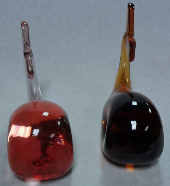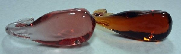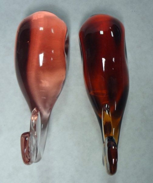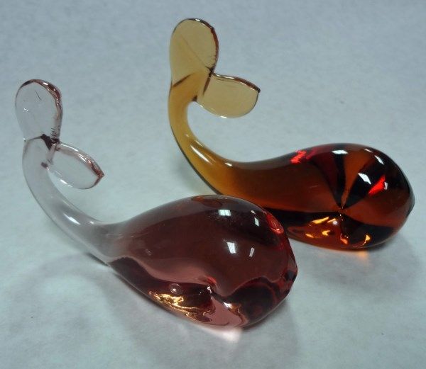 Pair of Whale Paperweights. Red and Amber in color. Not marked.