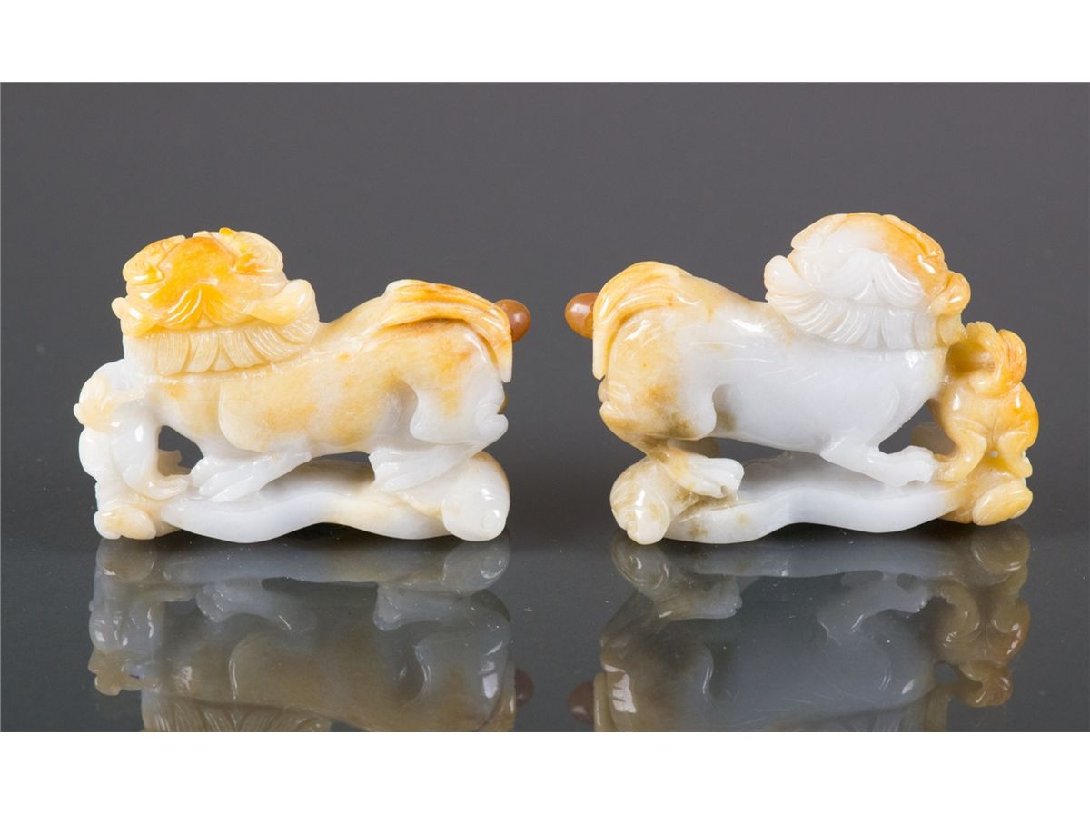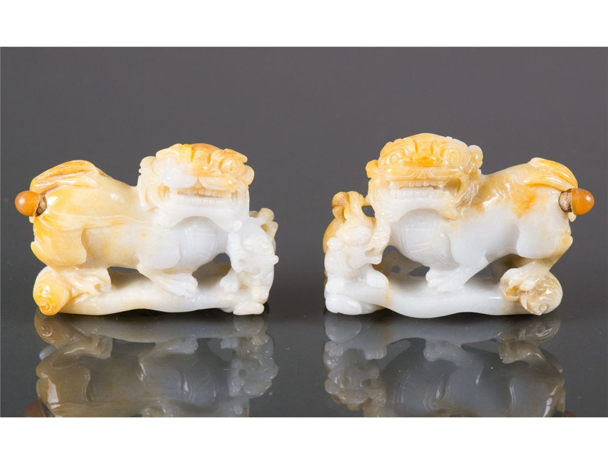 Pair of Chinese jade carved snuff bottles; featuring Fu dogs with their babies; of white tone with russet suffusions; H: 5 cm, W: 7 cm, 182 grams total