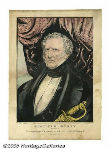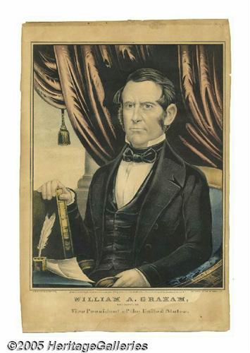 <B>Pair of Winfield Scott and William Graham Campaign Prints by Currier</B></I> 10" x 14" hand-colored small folio lithograph published by Nathaniel Currier in 1852, titled "Winfield Scott. Whig Candidate for Fourteenth President of the United States. From Daguerreotype." The "Hero of Many Battles" is posed beneath some billowing draperies with his sword in plain sight. Colors are strong, including deep rose, yellow, powder blue, pale green and flesh tone. Overall condition is fine with some light dampstaining. Sold together with the mate for the Whig Vice Presidential nominee, William Graham. It is titled "William A. Graham, Whig Candidate for Vice President of the United States." Graham is pictured seated, clutching a book, with inkstand and letter on a writing desk in front of him. This print is moderately, but evenly toned with a minor dampstain in the lower right corner. These are scarce! Lot:256