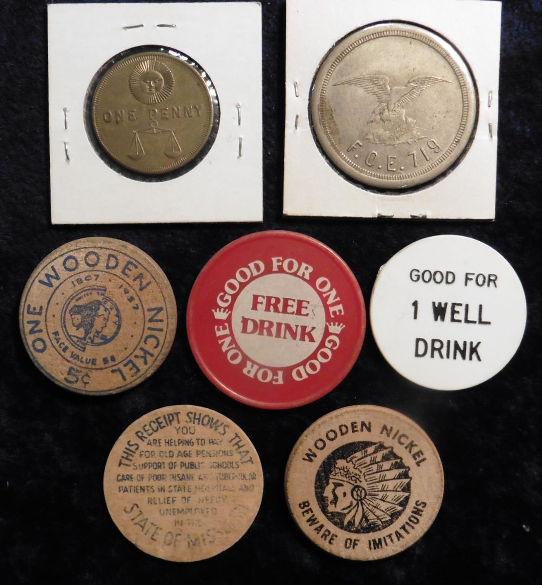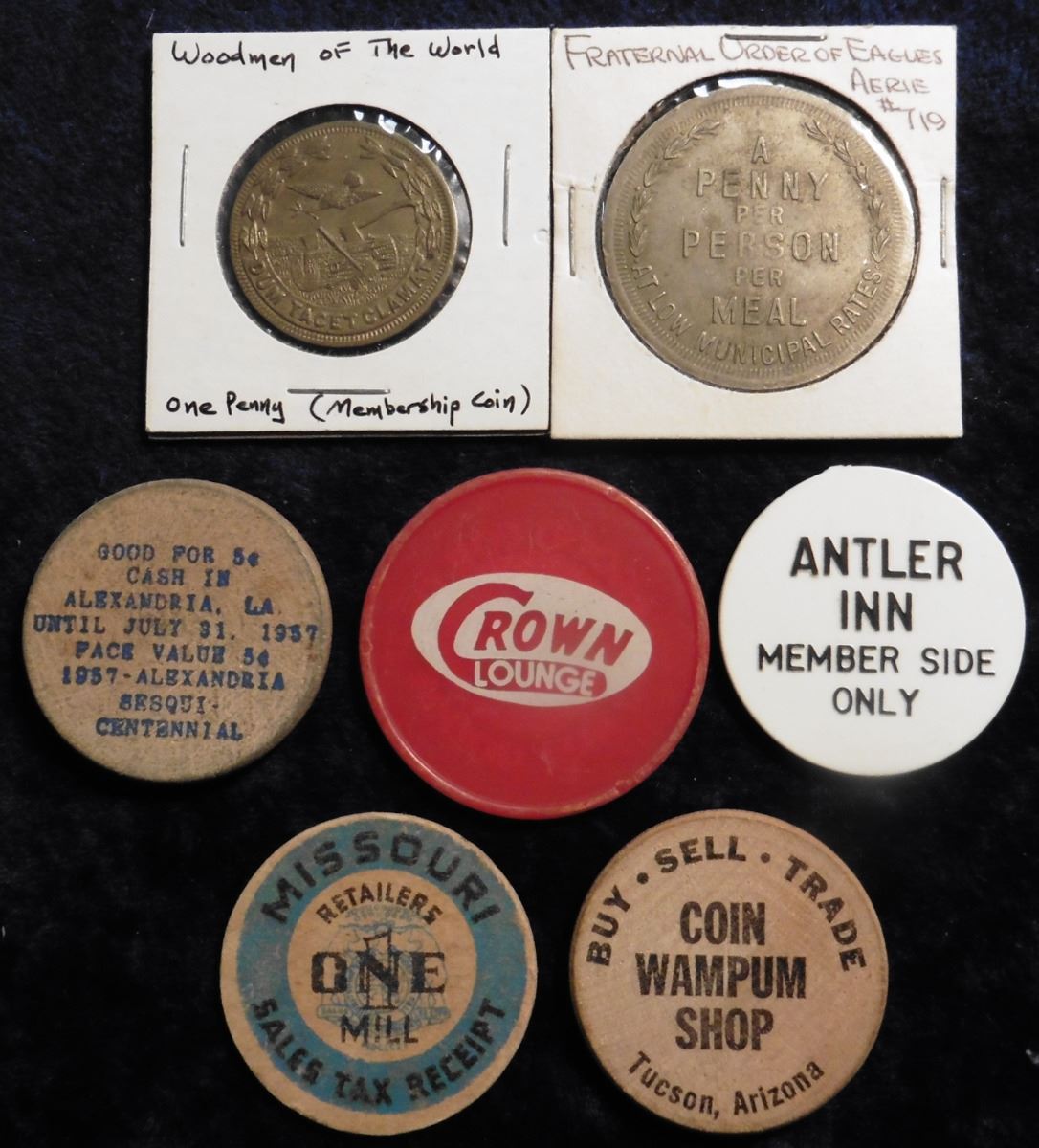 Pair of Wooden Nickels; "Woodmen of the World" One Penny; (3) odd material Tokens; & "Fraternal Order of Eagles Aerie # 719", "A Penny Per Person Per Meal" Token.