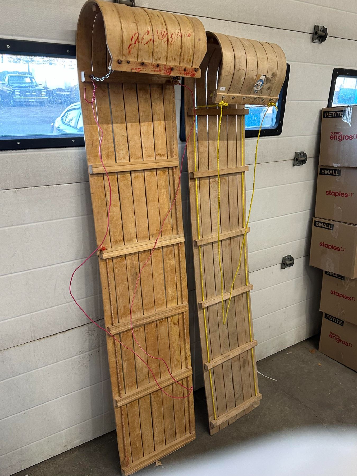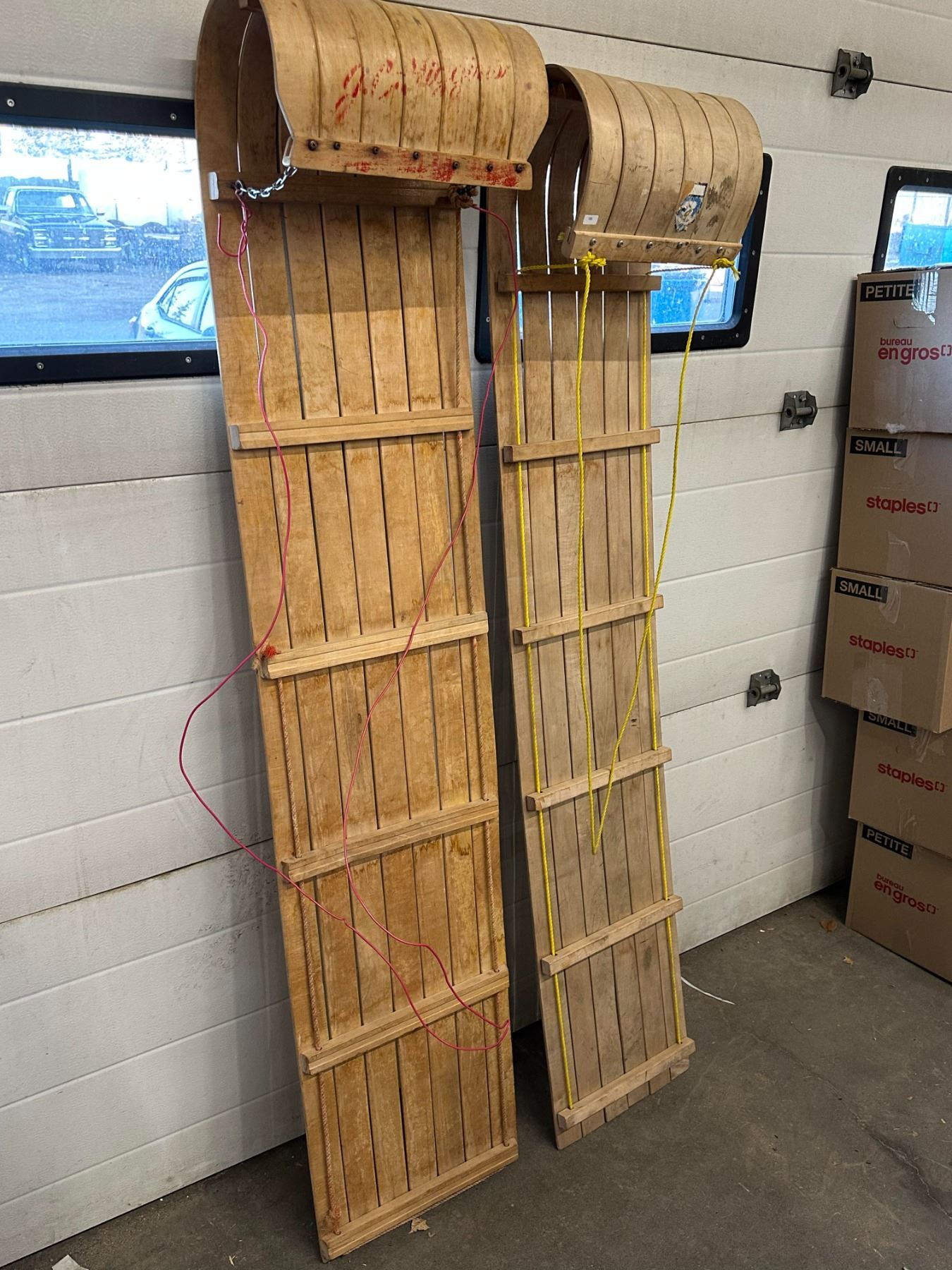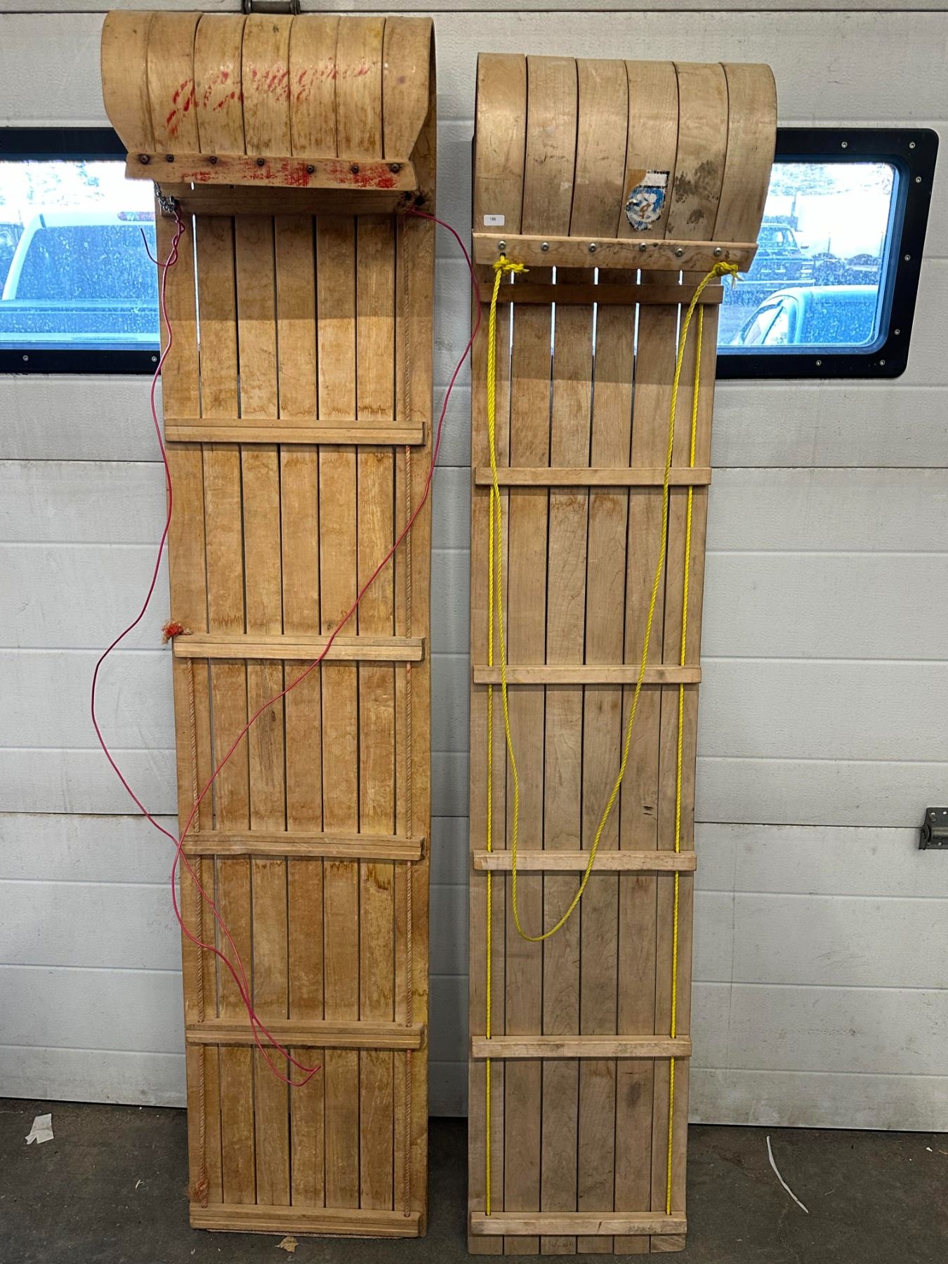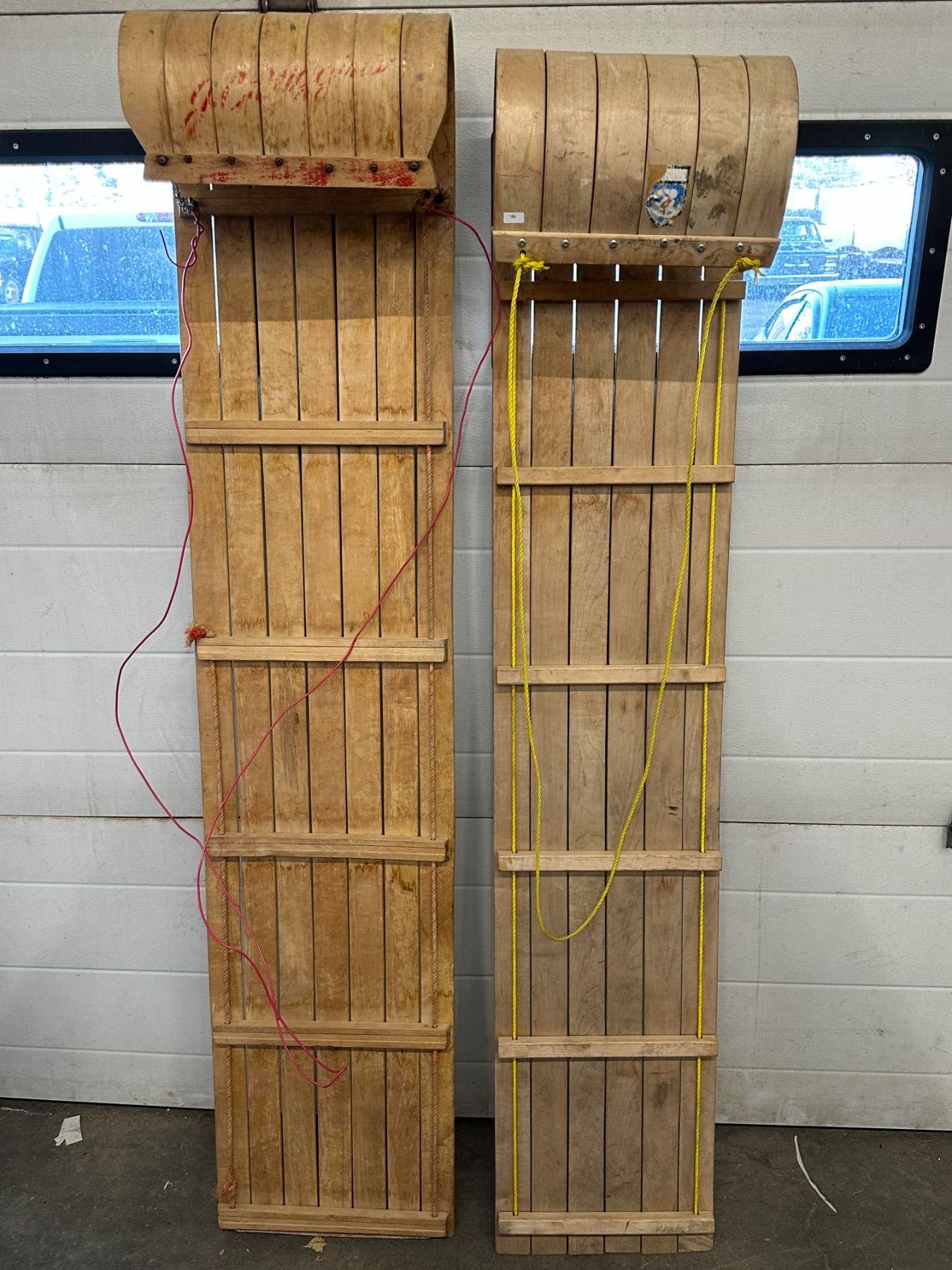 Set of two wooden toboggans with rope pulls. Approx. mid late 20th century. Condition: general wear.