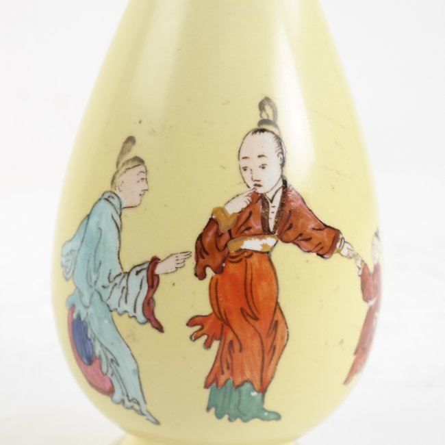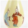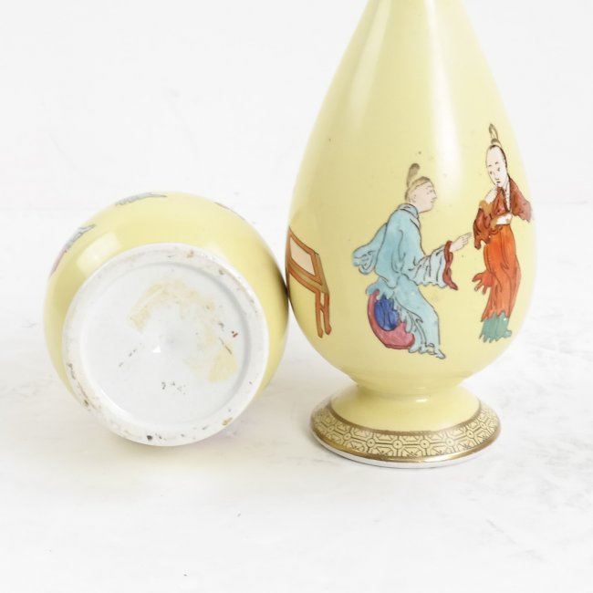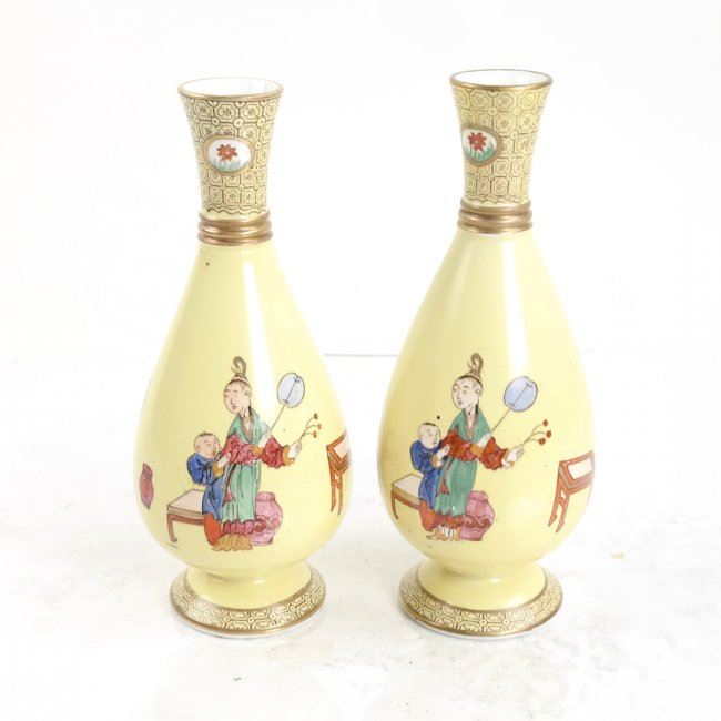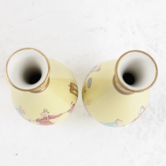 Pair of yellow Asian-style painted vases with pinched necks. [7 1/2" H x 3" Dia]. In fair condition, various chips in paint.