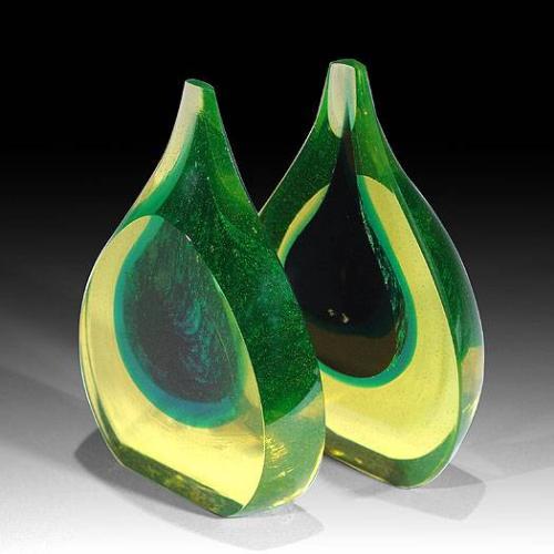 Pair of yellow and blue abstract design plaque-like paperweights. Two, flat, teardrop-shaped pieces of translucent yellow glass, each with a dark blue teardrop-shaped form on the interior. Signed, James Billeci (?). Height of each 3 7/8".