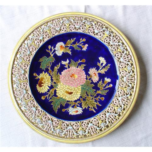 Pair of porcelain faience platters made by the Zsolnay factory of Pecs, Hungary. The design displays polychrome painted chrysanthemums on an ultramarine blue ground. The central motif is intricately bordered by a pierced and gilt rim. There is light crazing throughout. Impressed on the bottom are the family trademark TJM Zsolnay logo, Zsolnay Pecs, and the numbers 5, 3430, 32. It has been restored.
