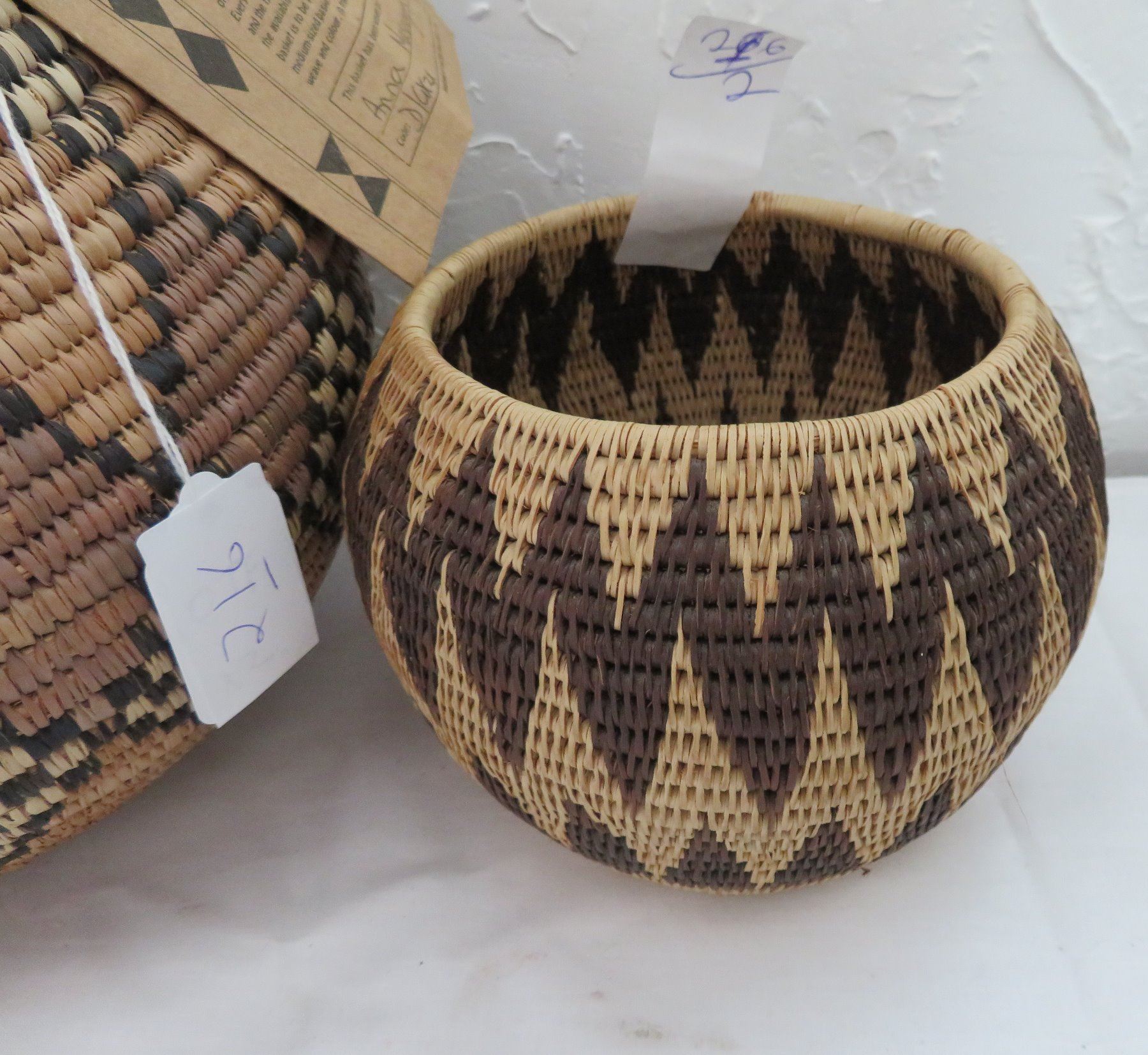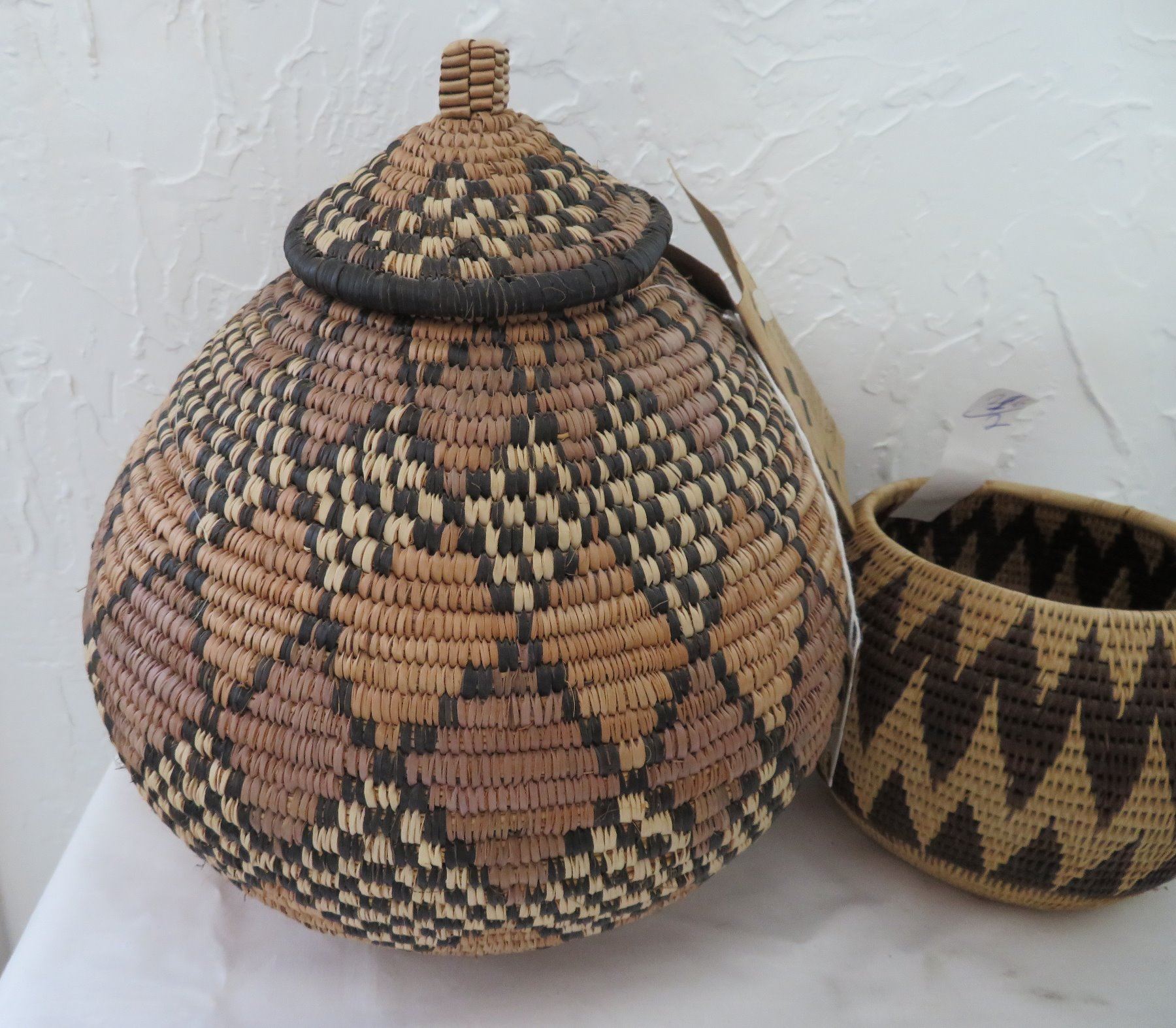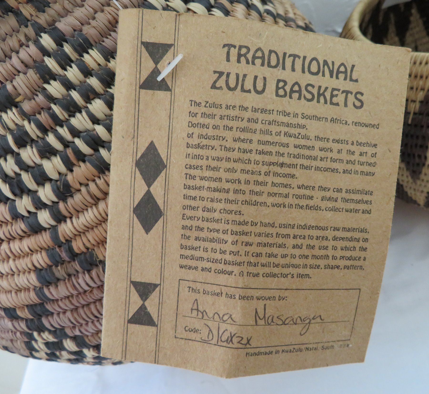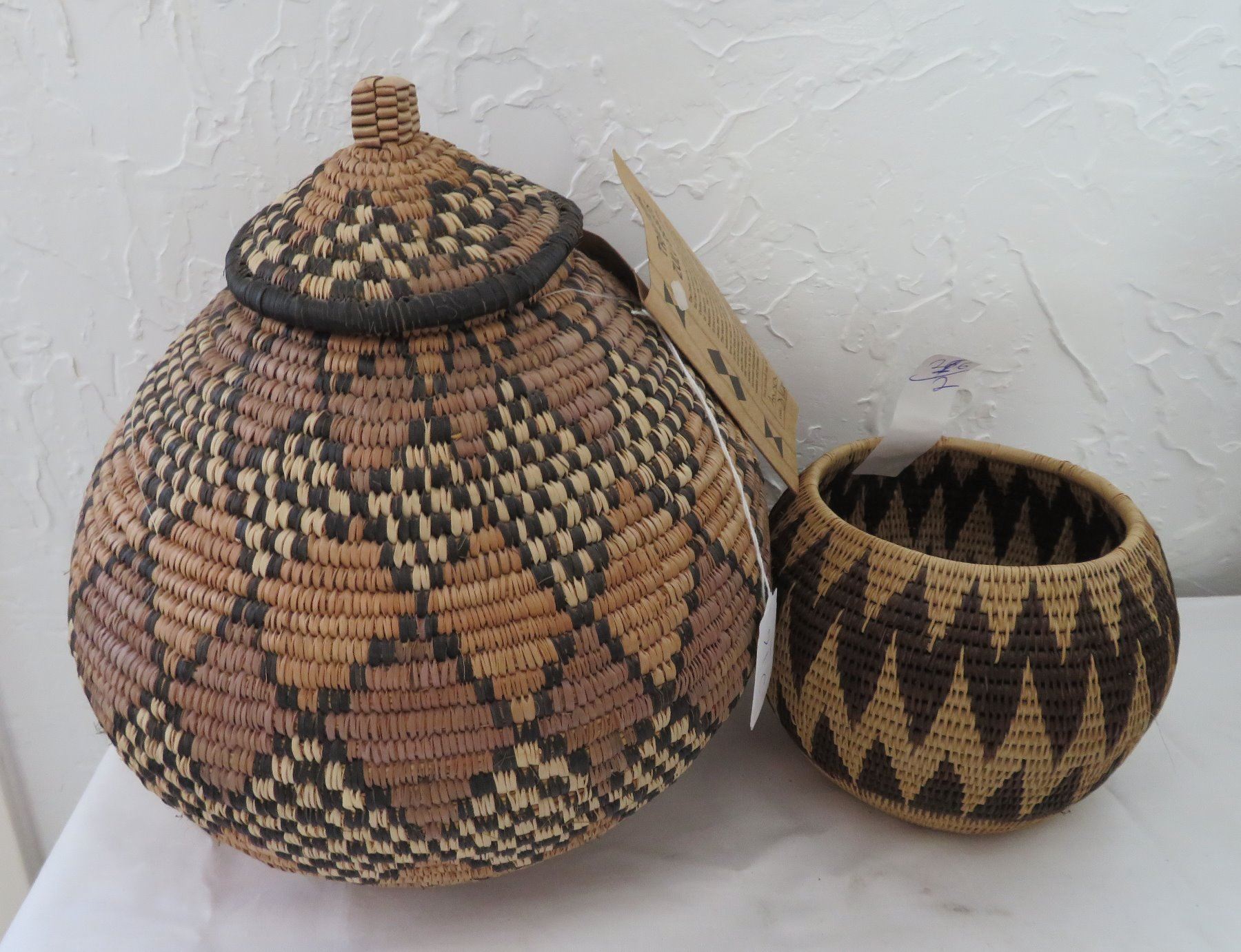 Pair of Zulu Baskets, c. 1990s. Made of grass, the items measure 10 1/2" x 9" and 6" x 5". South Africa. Polychrome geometric, many Zulu baskets win prizes worldwide. Condition: Good, see images. Shipping: $30.00 w/insurance and signature.