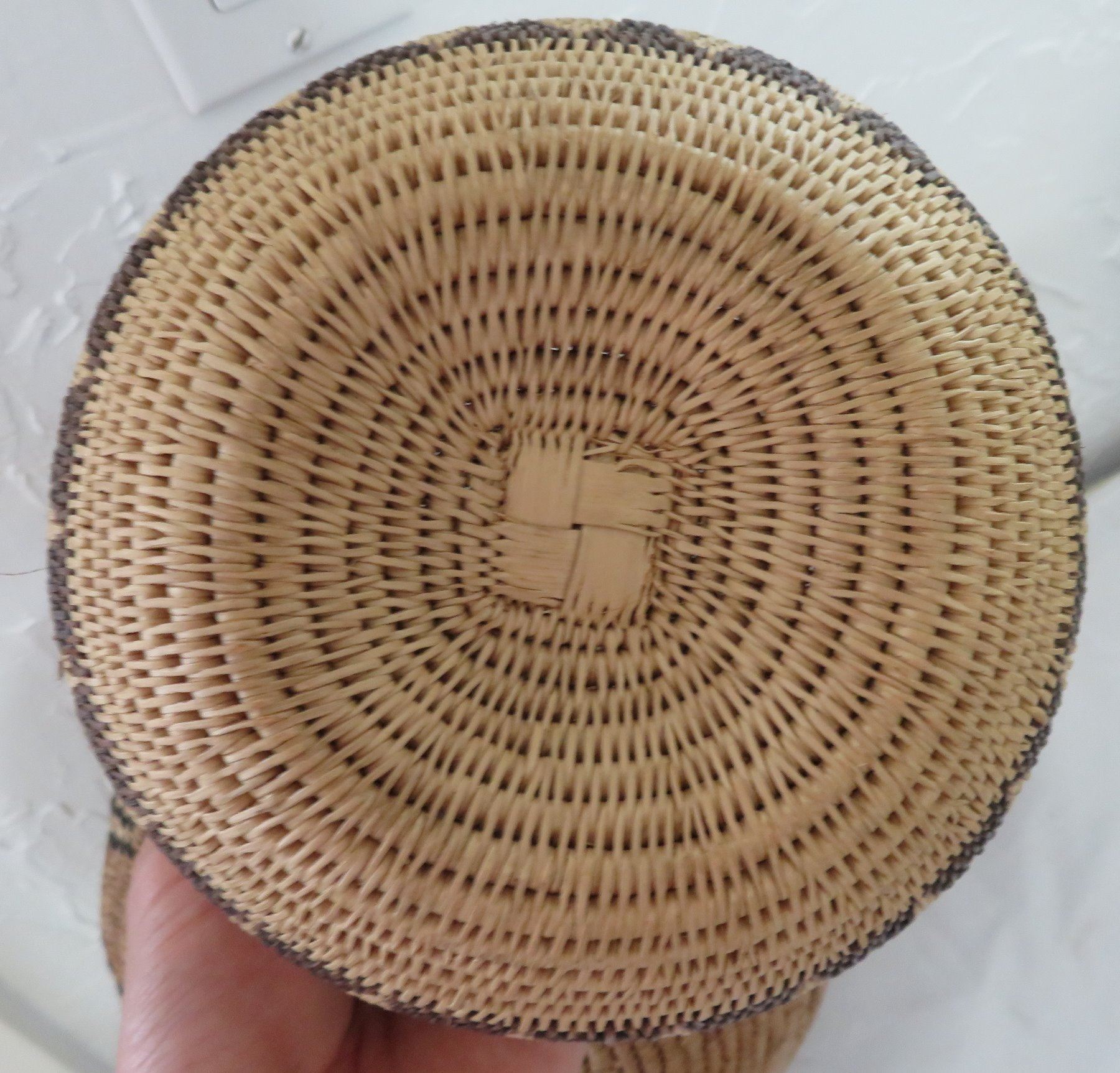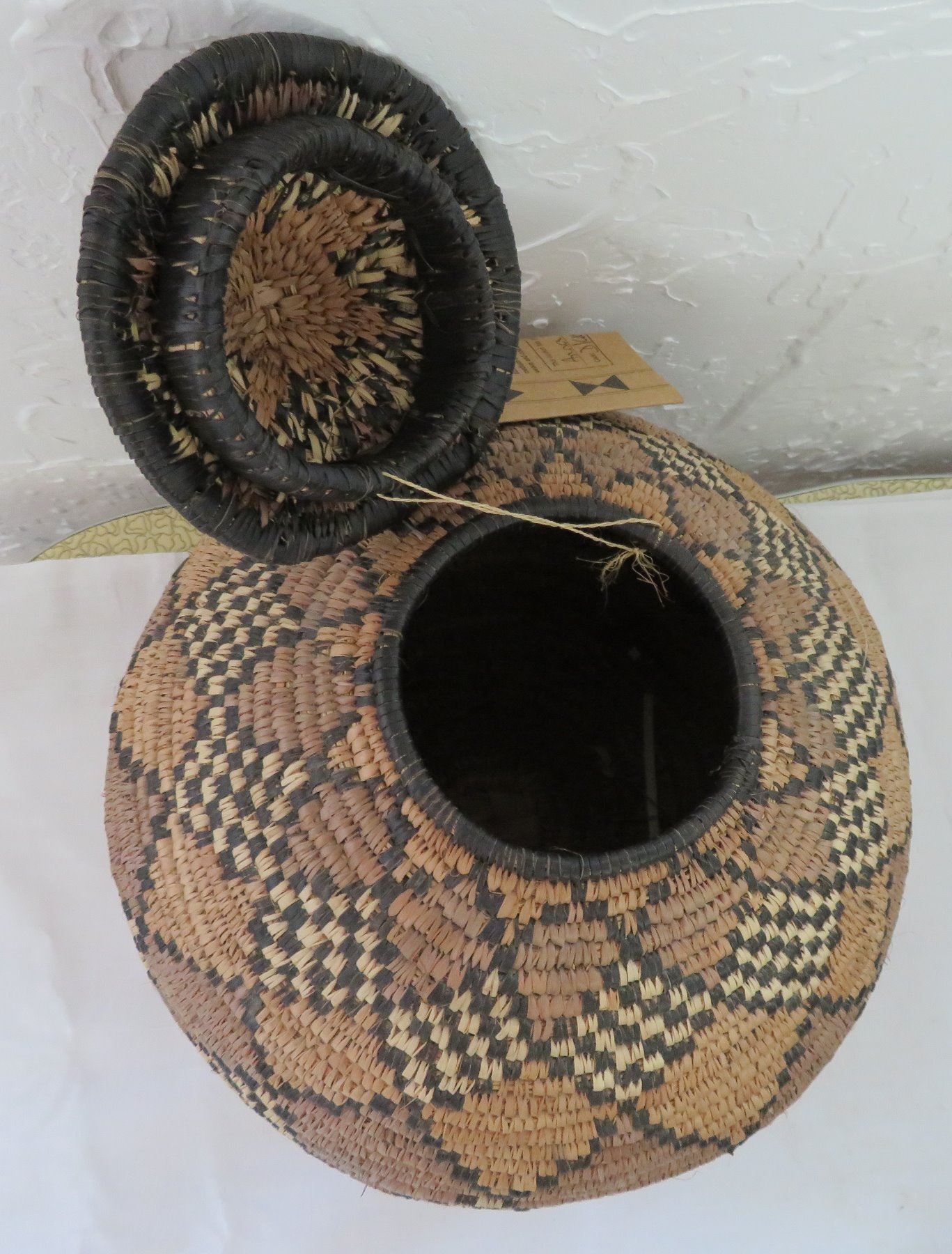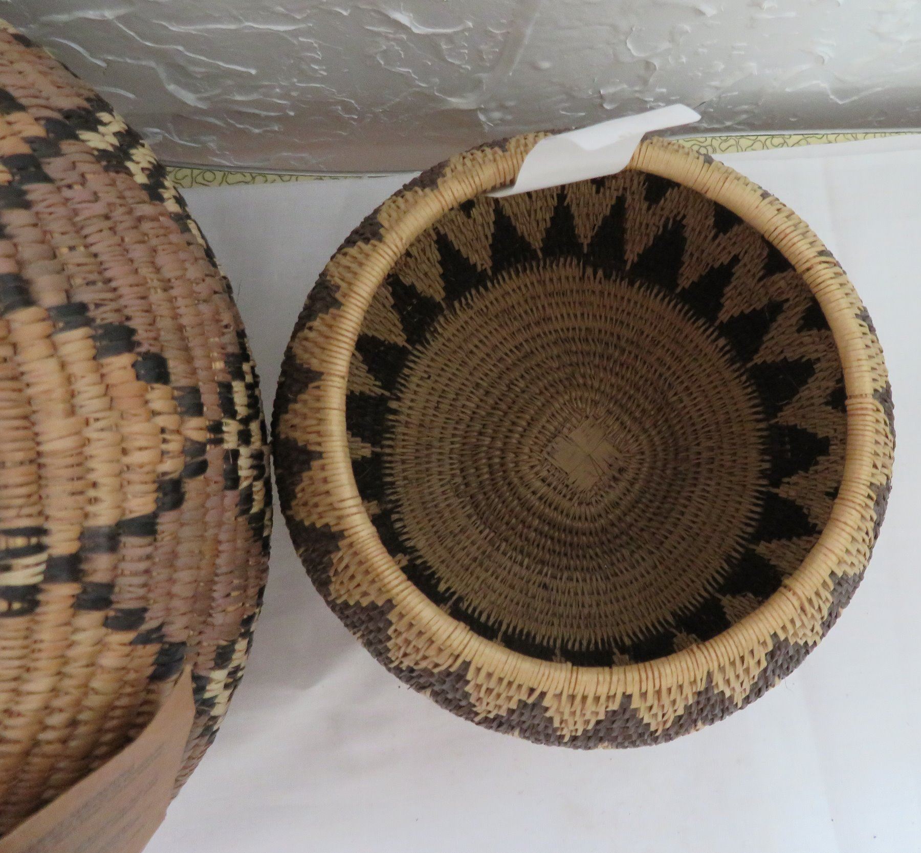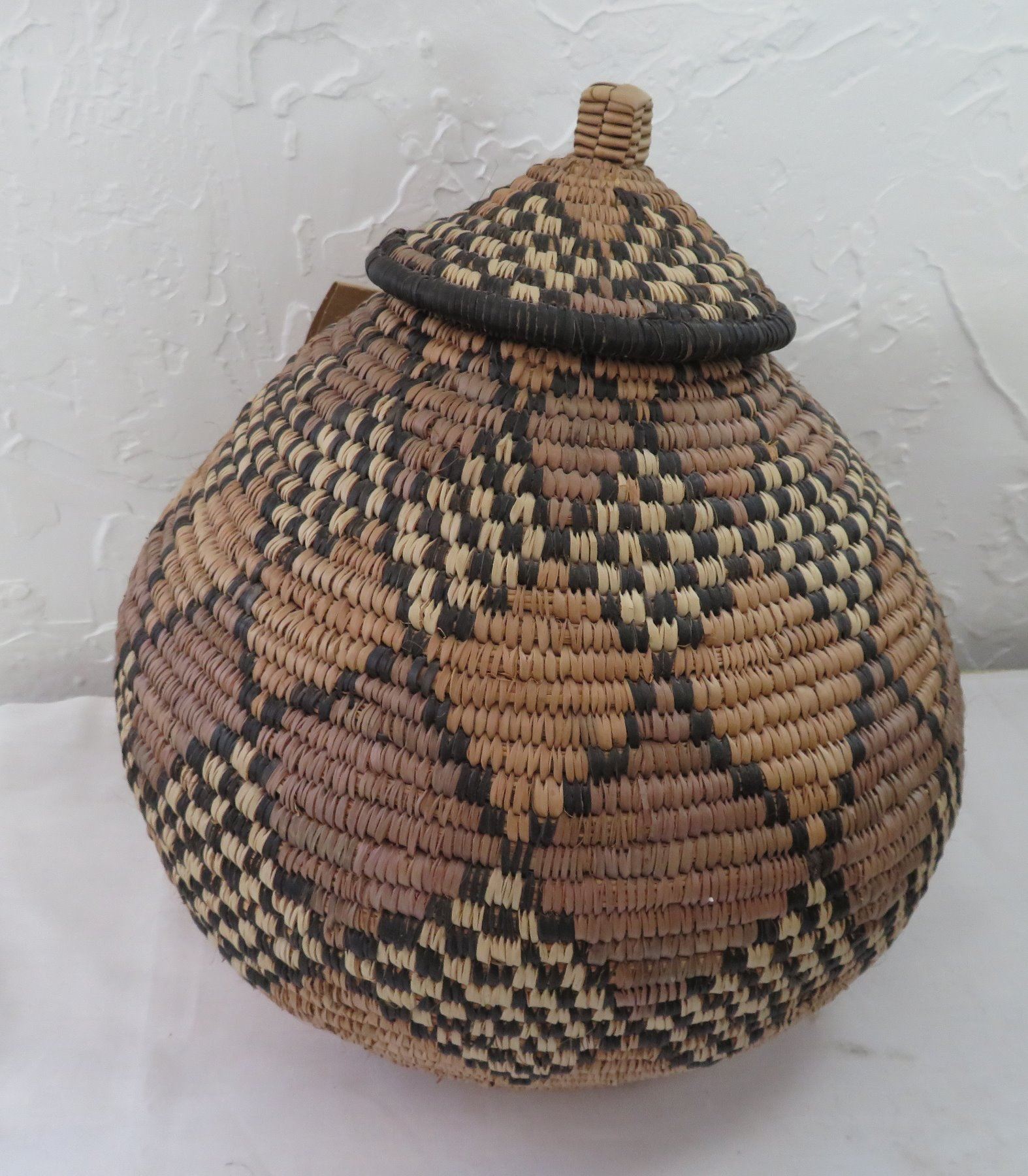 Pair of Zulu Baskets, c. 1990s. Made of grass, the items measure 10 1/2" x 9" and 6" x 5". South Africa. Polychrome geometric, many Zulu baskets win prizes worldwide. Condition: Good, see images. Shipping: $30.00 w/insurance and signature.