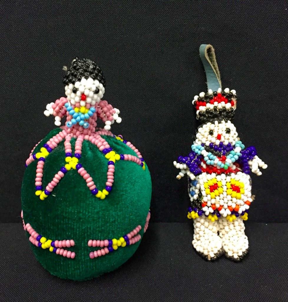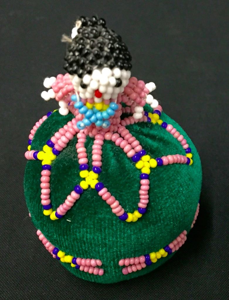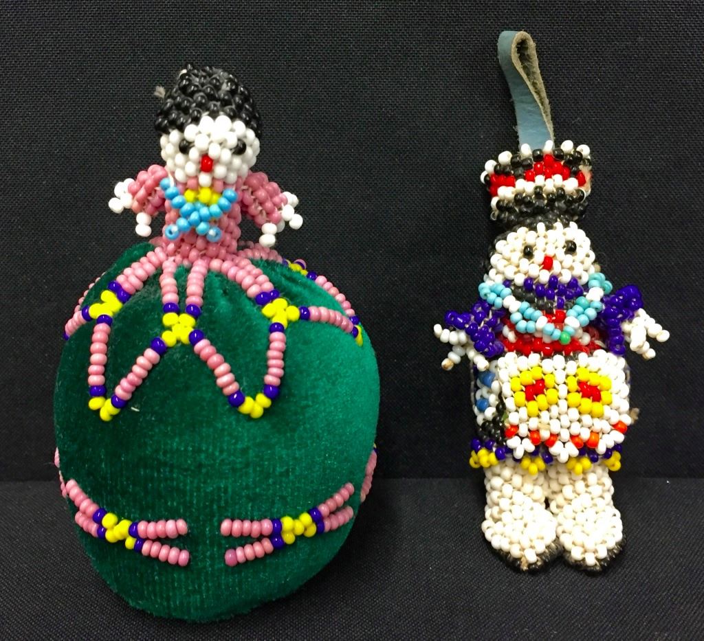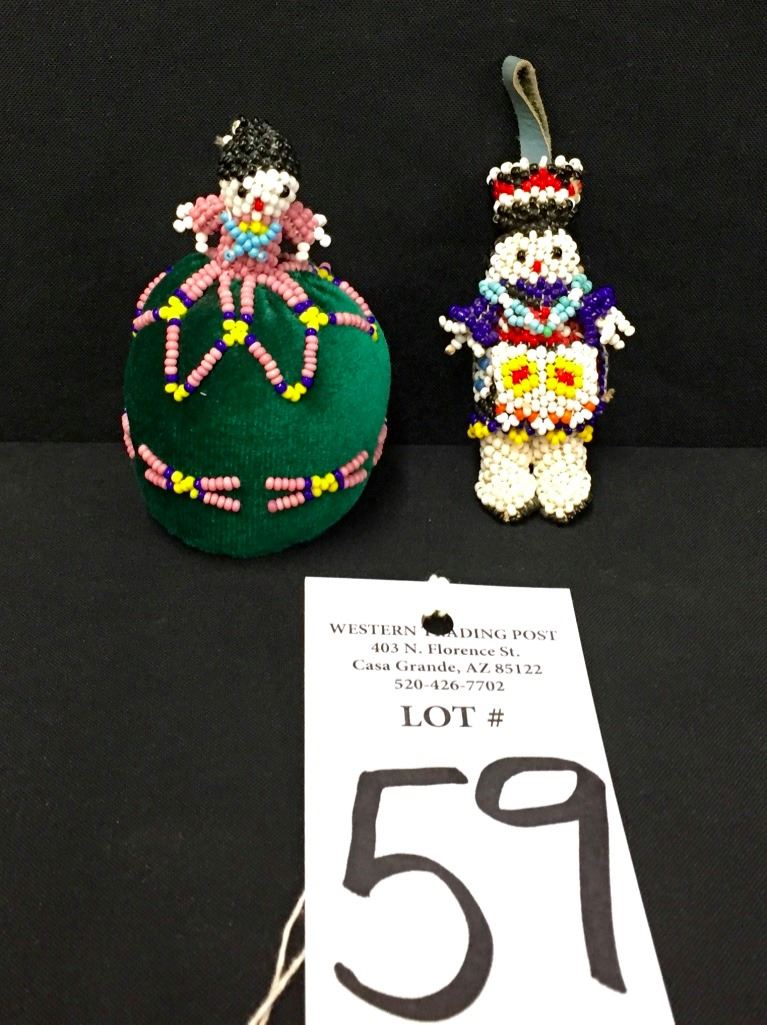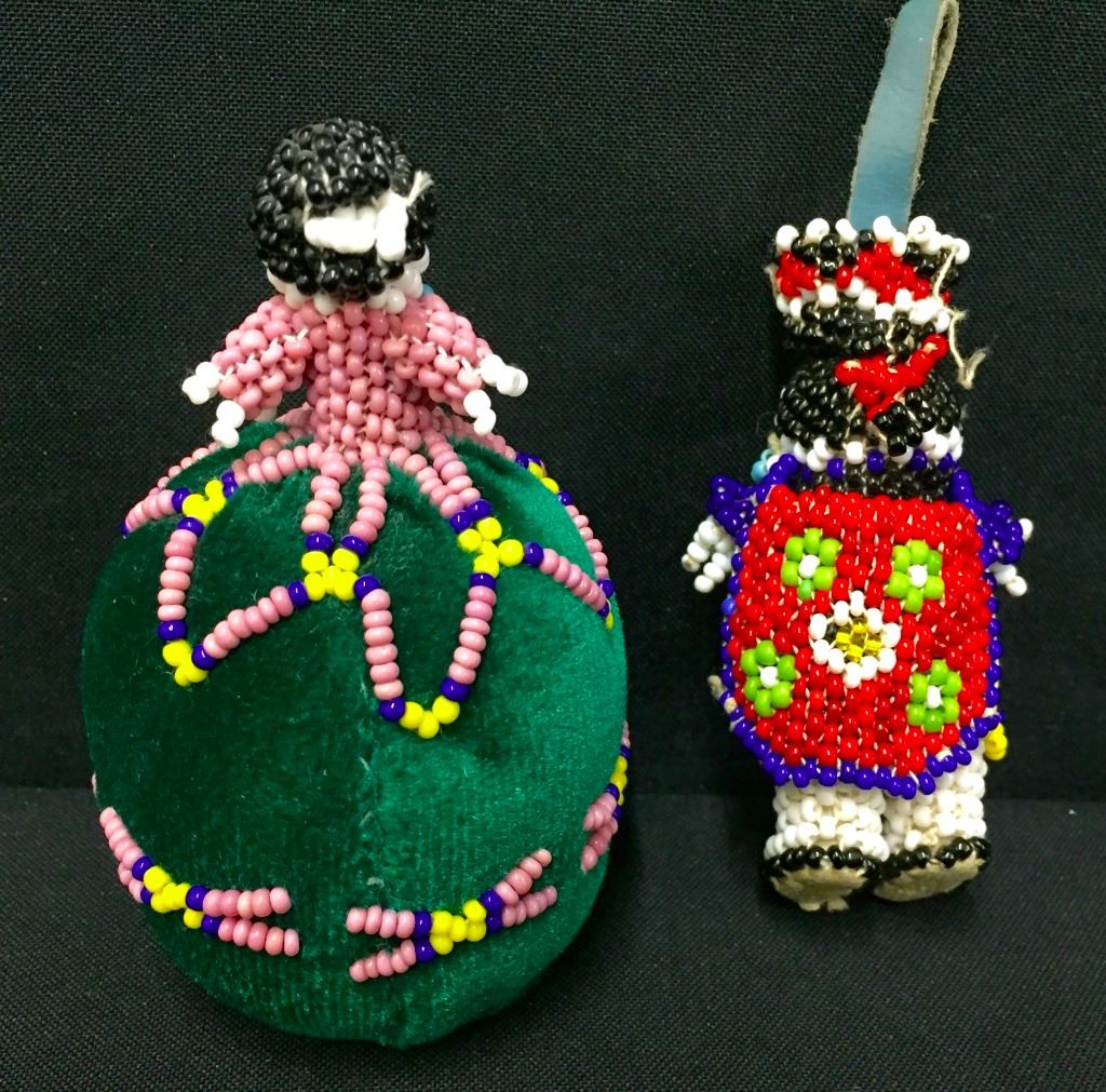 Maker: Unknown Zuni bead artist. Approx. Age: Circa 1970s. Size: 3” - 3.5” tall. Condition: Good. Additional Info: A nicely done beaded Zuni dancer with a beaded cape and kilt and also a beaded pin cushion. Please look closely at the pictures - they are an important part of our description. Shipping: There will be a $5 handling / packaging fee for shipping this lot. The actual cost of postage will be added on top of that.