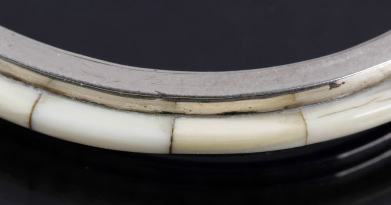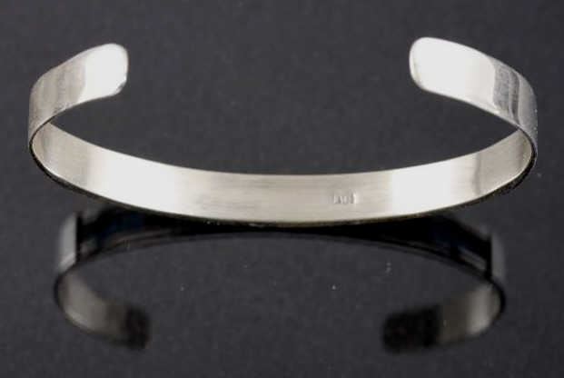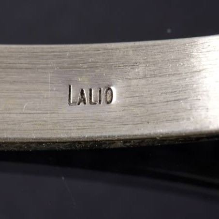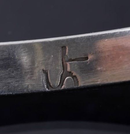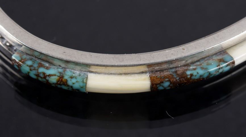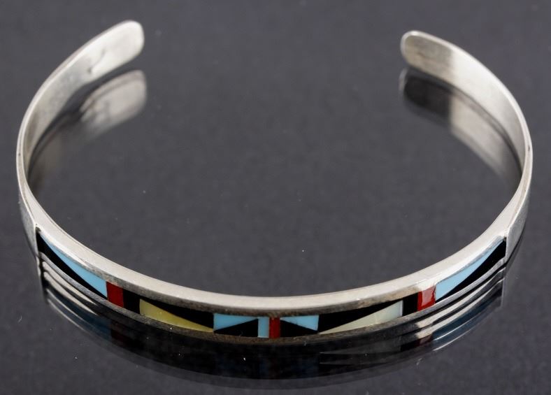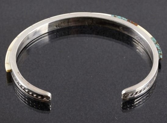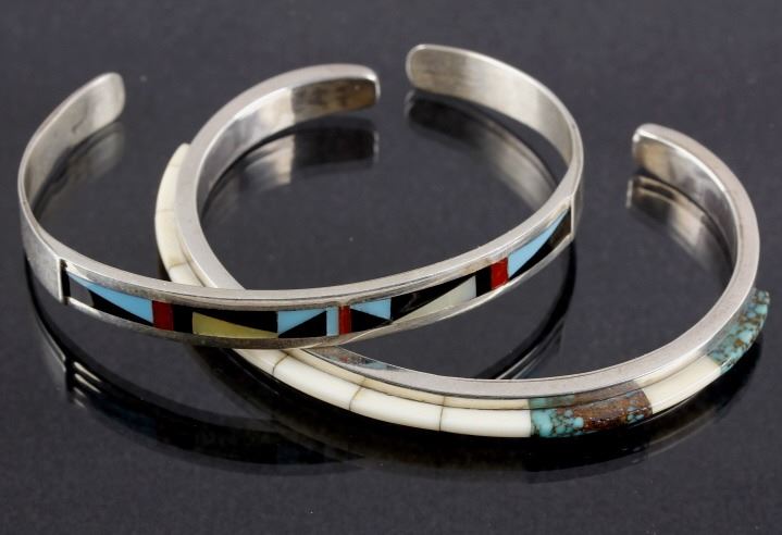 Contained in this lot is a pair of two signed Zuni Native American Indian bracelets, or cuffs. The first cuff showcases chip turquoise, mother of pearl, oxblood coral, and onyx - inset into a geometric mosaic motif. This cuff is signed "Lalio". The second cuff boasts nine bone fragments, and two chips of Royston turquoise - cut into elongated rectangles, and placed in a striking line across the face of the bracelet. This cuff is signed "JK", and additionally shows a pictorial aspen tree hallmark. Both cuffs show good condition, with a nice white mirror silver tone. Both cuffs are approximately the same size, though the bone & Royston cuff is slight larger due to the orientation of the stones. The larger cuff measures 2 5/8" wide, and 1 7/8" tall. The inside circumference of both cuffs equals approximately 6 3/8".