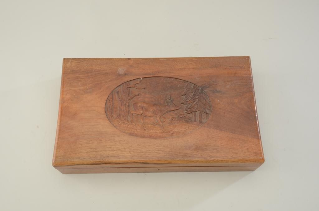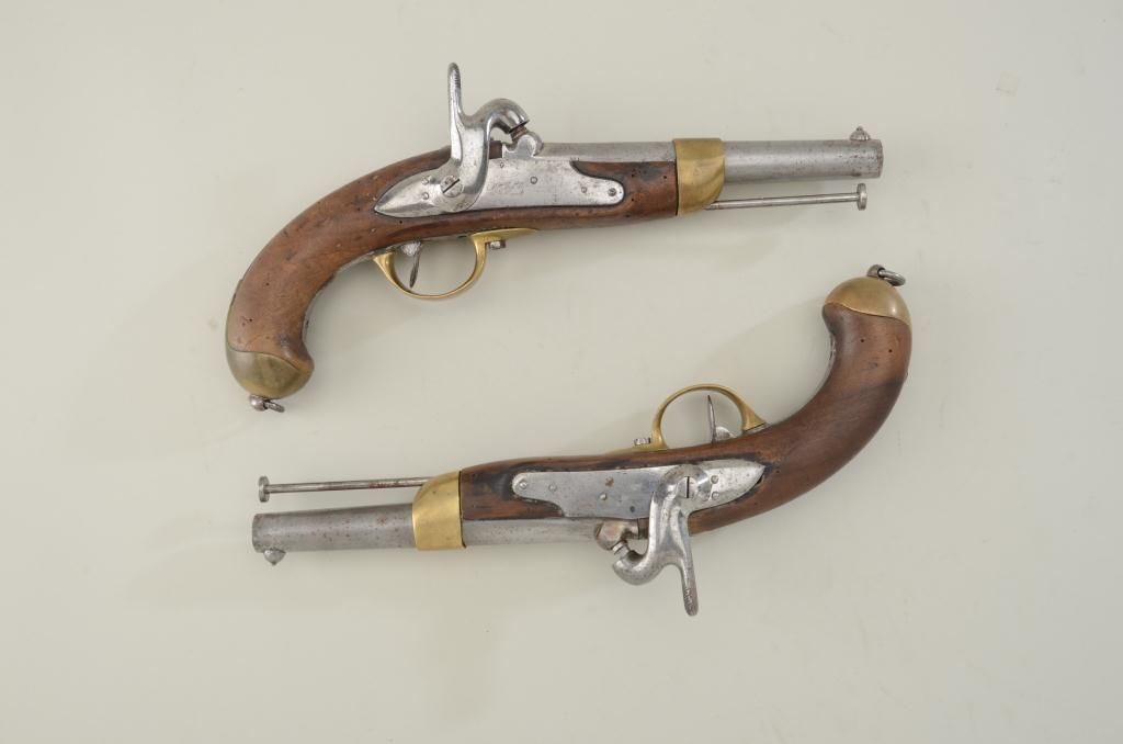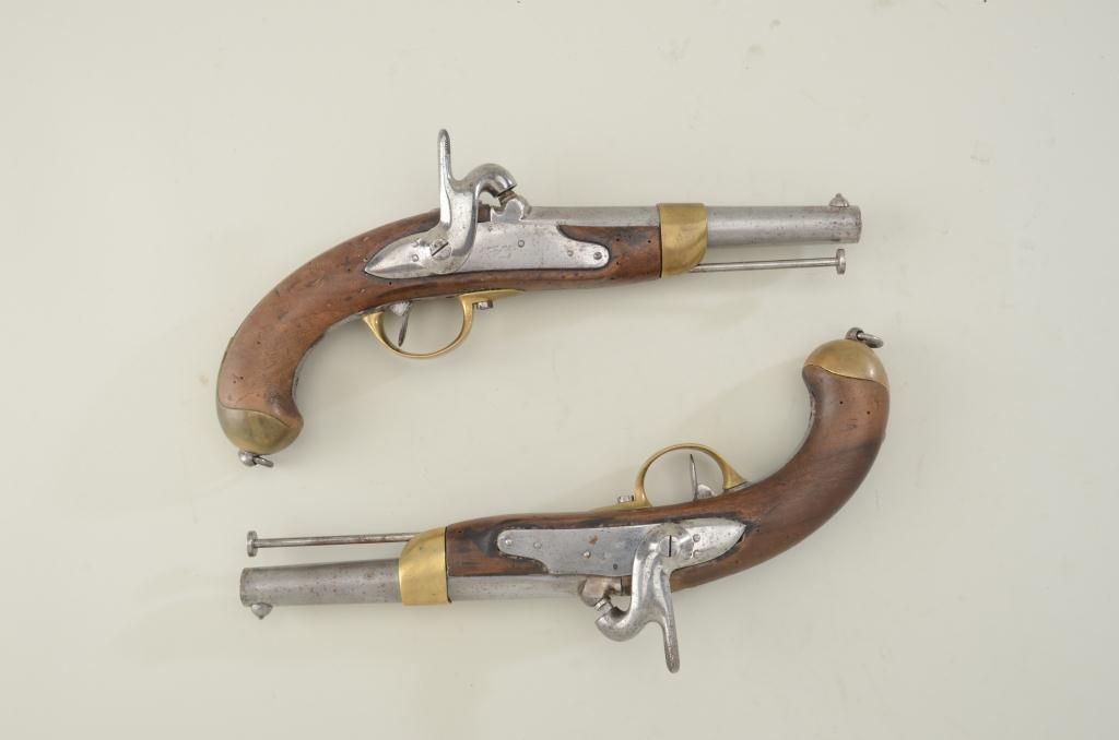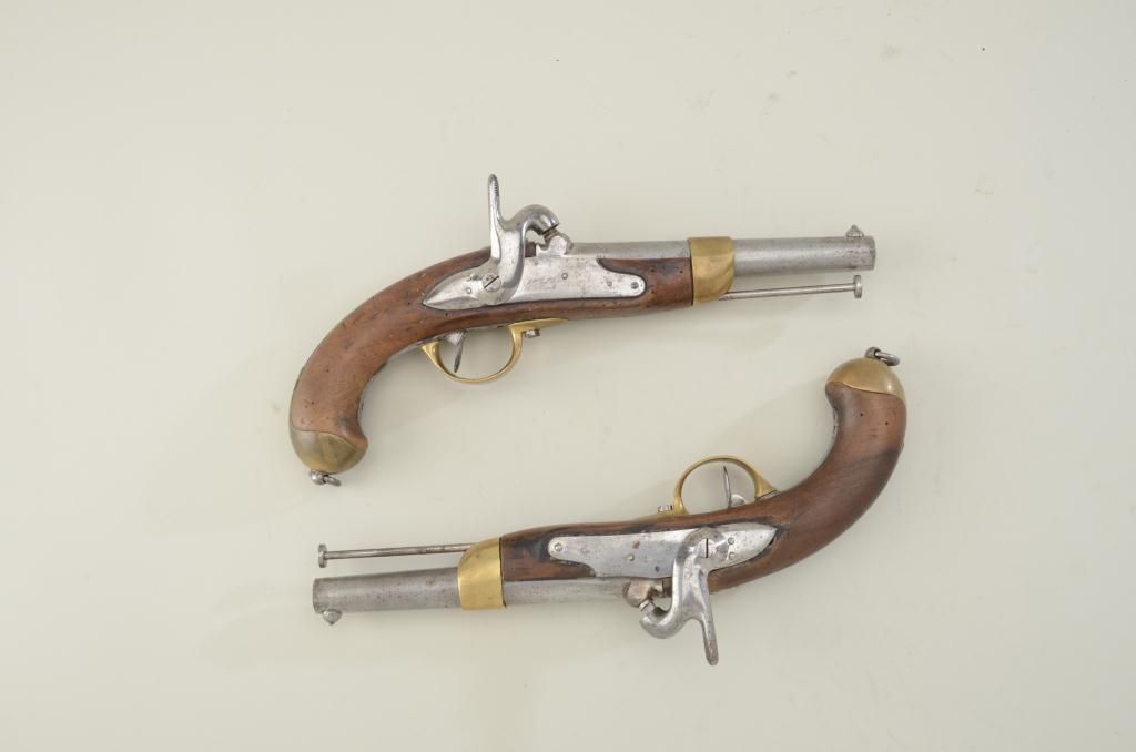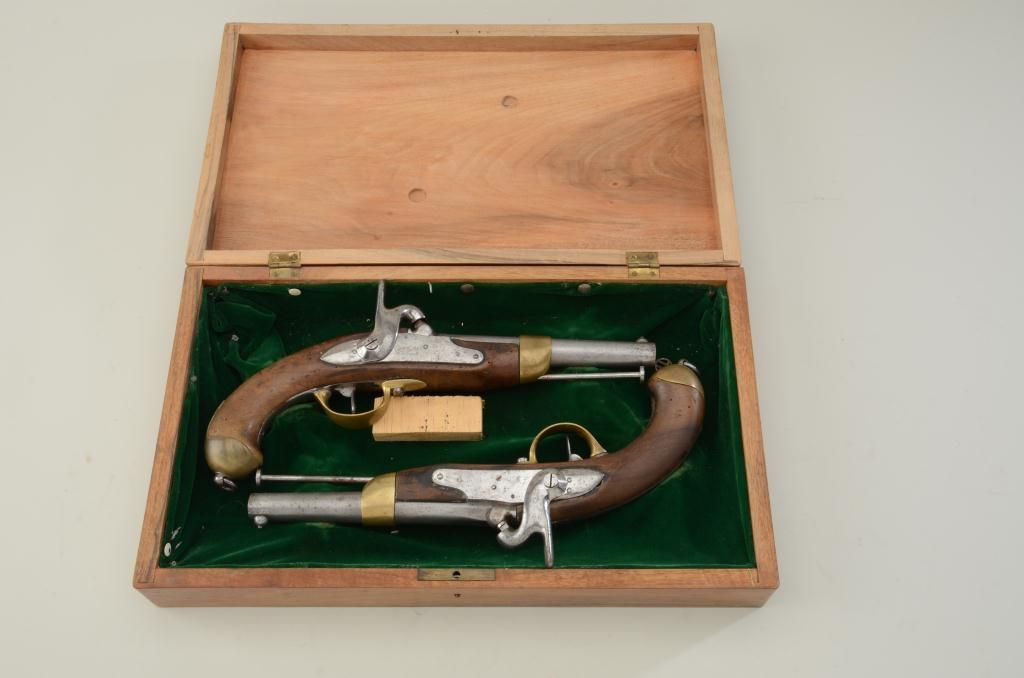 Pair of antique percussion single shot pistols in custom modern wood case with carved game scene on top of lid; pistols .70 caliber with 8” barrels, bright finish, brass trigger guards, butt caps and barrel bands;lanyard rings; iron ramrods wood stocks; both guns are overall good with good actions, dark bores, marked Mle 1822 and lock plate marked “Mre Impale de Chatellevault”; one is proofed “P” and the other proofed “D” abovethe lock plate markings; box is overall good in condition but lining has not been completely accomplished. Est.: $650-$800.