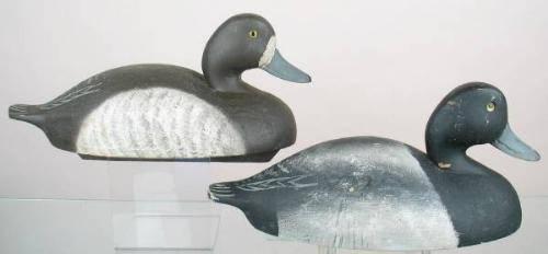Pair of balsa Wildfowler Factory bluebill decoys in XOP with a few minor rubs on the surface and a visible seam line from the back of the head to the tail. Heads and keels are made of pine. Hen has a slight separation at the grain line above the bill. Drake has the Quogue, LI circular impressed brand on the bottom. (decoy)