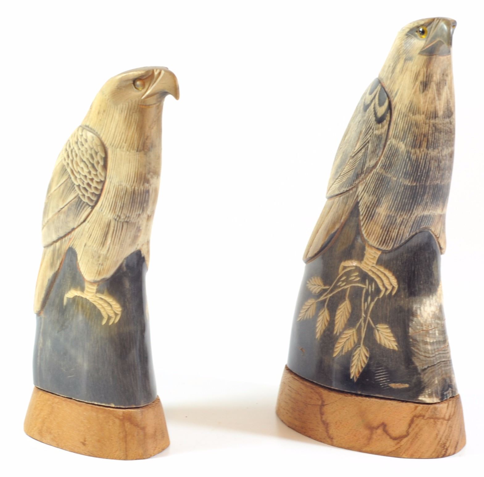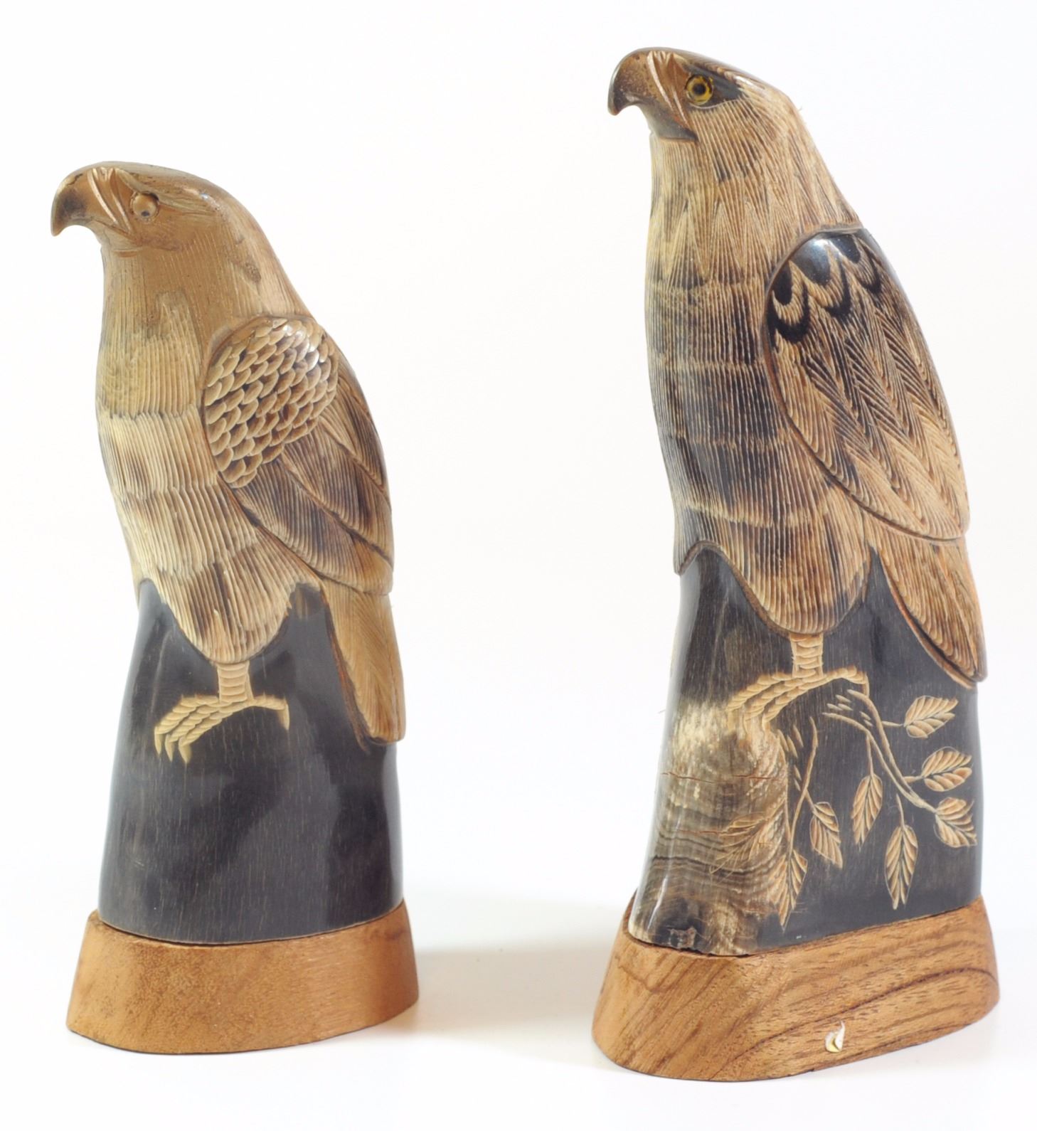 Pair of bird figurines carved in an animal's horn, hand-carved, mounted on wooden base, height: 17-19 cm.