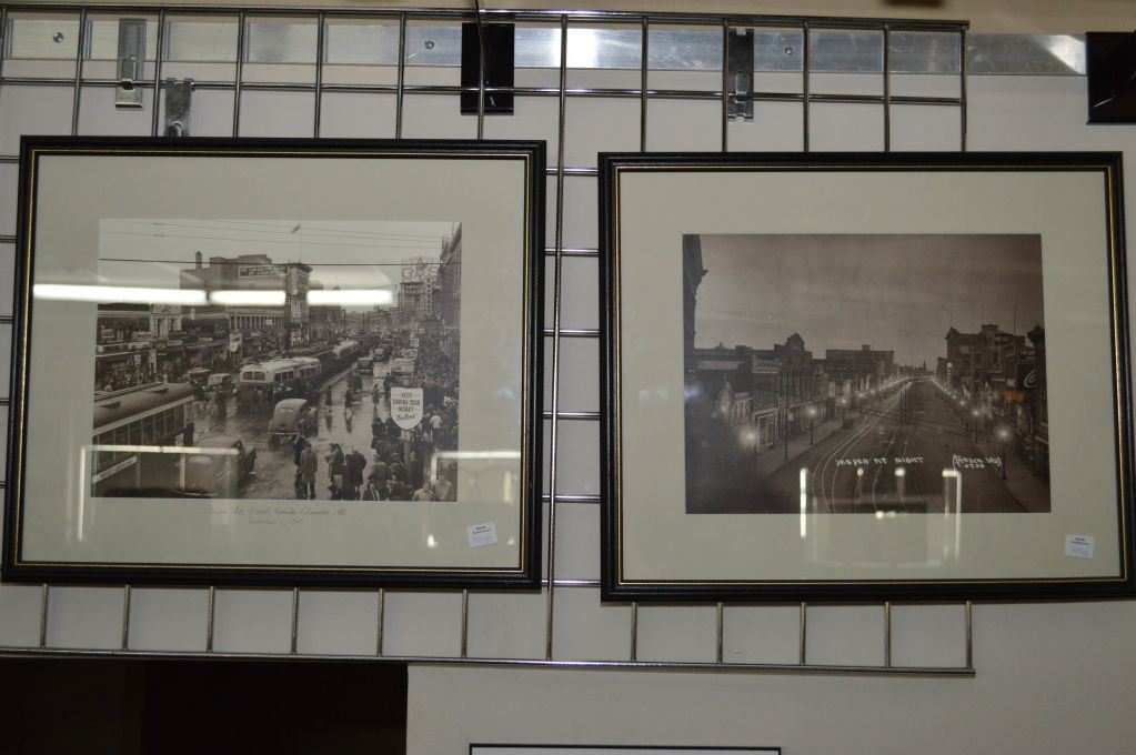 Pair of black and white archive photographs one labelled "Jasper Ave Street Parade Nov. 5th 1945" and the other "Jasper At Night"