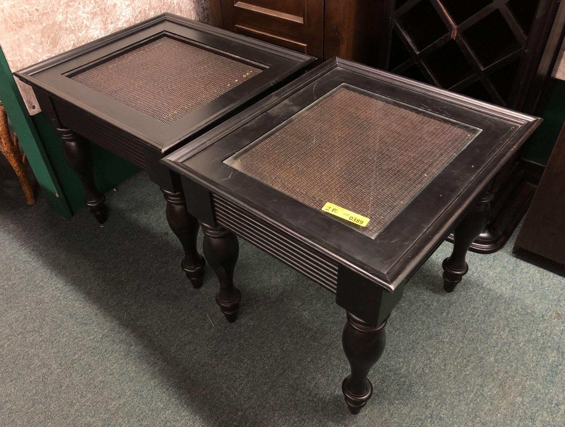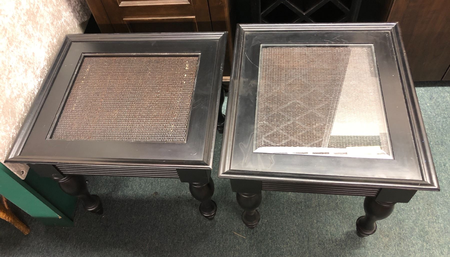 Pair of black end tables (1 piece of glass missing) 28in W 25in D 26in H