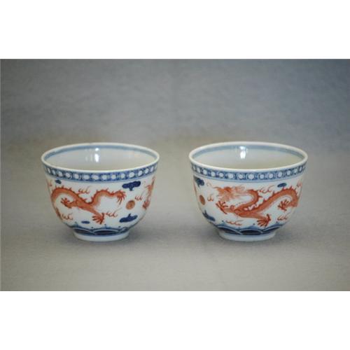 Pair of blue and white with red dragon porcelain cups.Guang-Xu mark.good condition.