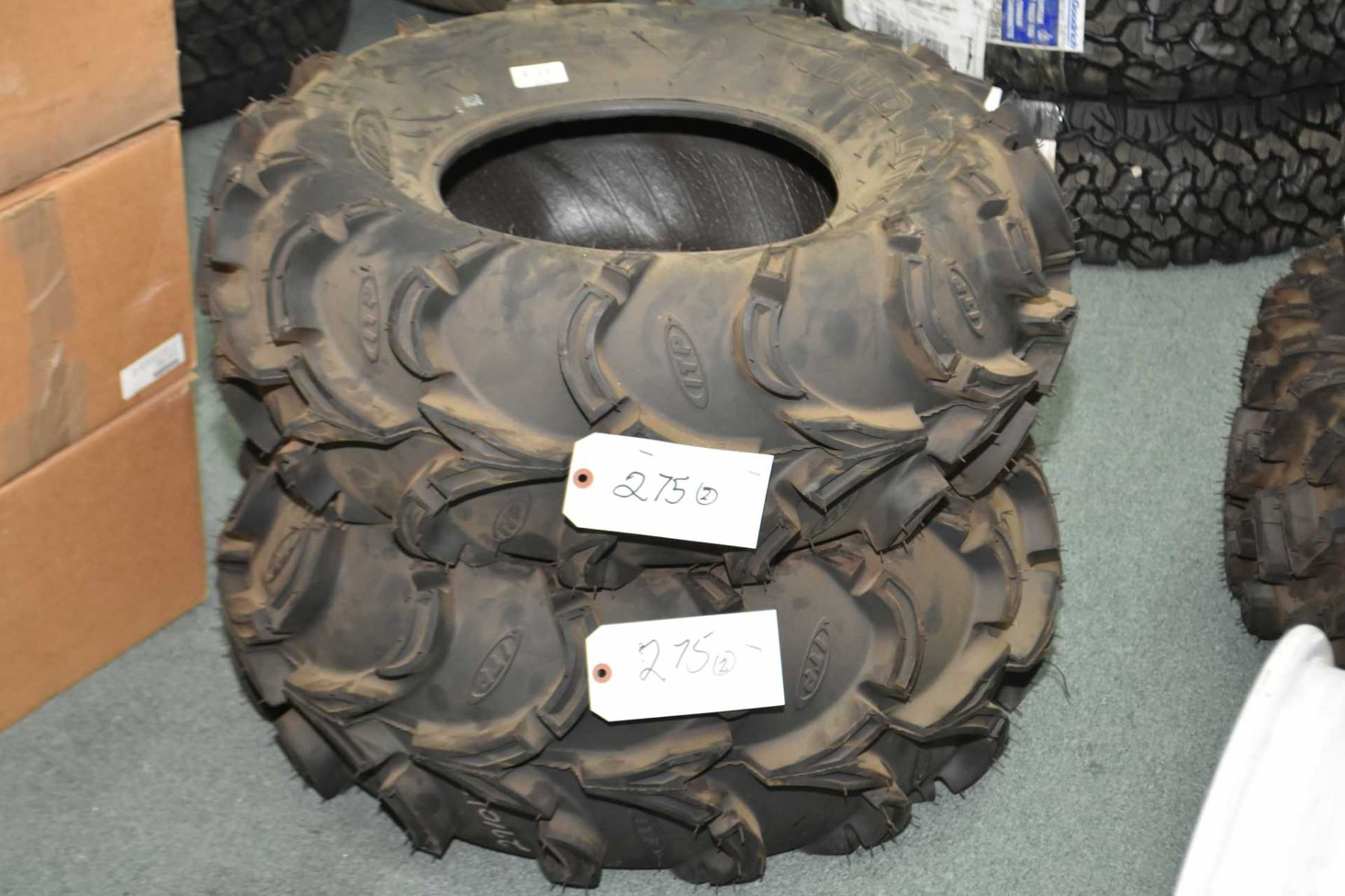 Pair of brand new ITP Mudlite ATV tires, 27 X 10-12- AUCTION HOUSE WILL NOT PROVIDE SHIPPING FOR THIS ITEM. BUYER MAY ARRANGE THEIR OWN COURIER.
