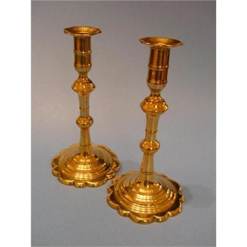 A pair of Queen Anne brass candlesticks with round scalloped bases.