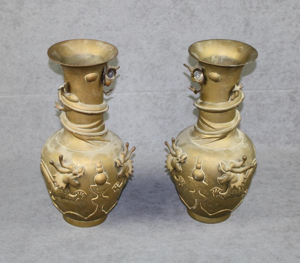 Pair of brass ornate Chinese vases approx.  16” in height and approx. 8” in diameter at  their widest point, both in overall very good  condition showing dragons and both with  Chinese character signatures at bottom ofbase.  Est.:  $175-$350.