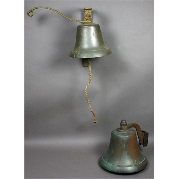 Pair of bronze ships bells with bronze brackets, 10 1/2" h. x 7 1/2 diam. (largest). Good condition.