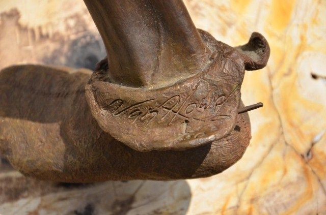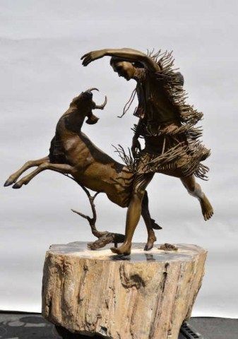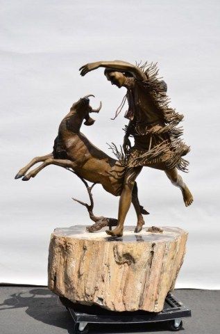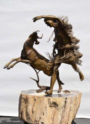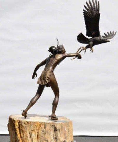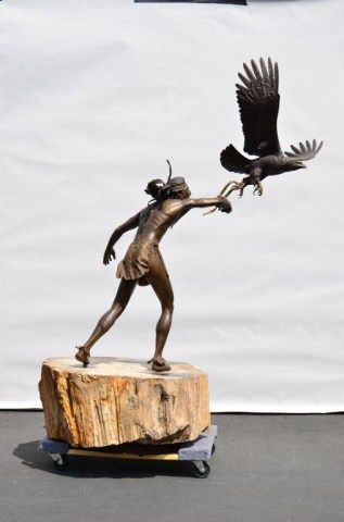 Pair of bronze statues by Doug Van Howd numbered 1 of 50. Showing Indian brave and Eagle and Maiden with young buck. Approx. 6ft tall including petrified wood bases which weight 100’s of pounds. The castings alonemeasure approx. 57” in ht. Doug Van Howd is among the best artists in the world at large bronze figures in our opinion. His study of The Pony Express Rider displayed at The Reno Grand Sierra Resort was appreciated bymillions and remains one of the finest artworks of modern times. These Two (2) bronzes adorned the entry to Petersen’s Penthouse office on Wilshire Blvd for about twenty years. From the Estate of RobertPetersen. Est.; $10,000-$30,000
