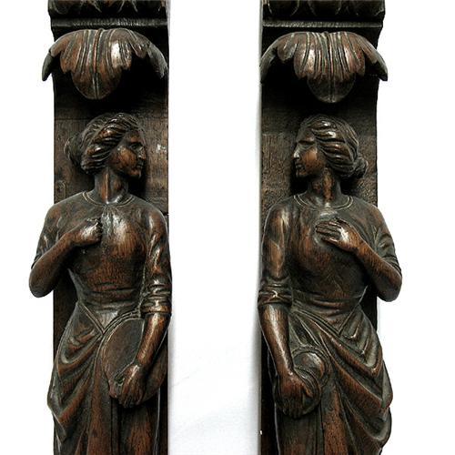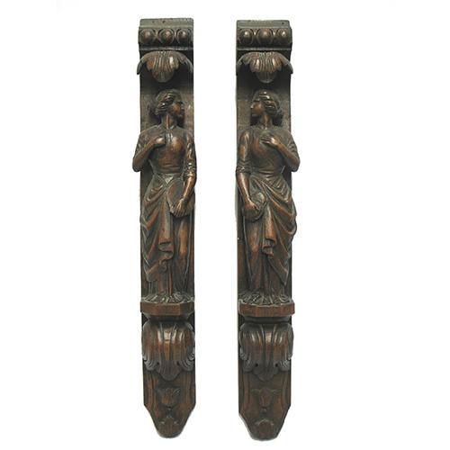 Pair of carved oak figural plaques;each with woman in draped clothing under acanthus leaf; figure is on stand over carved leaf; 19th C.; 27 1/2" high x 3 1/2" across x 3" deep; no visible defects