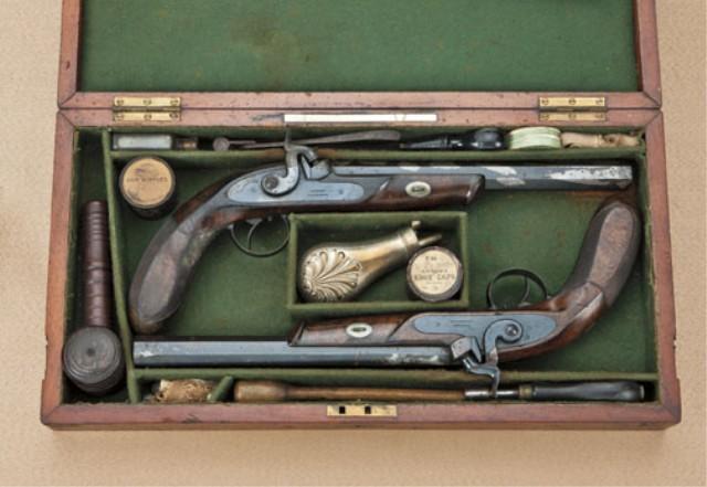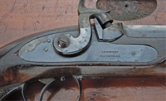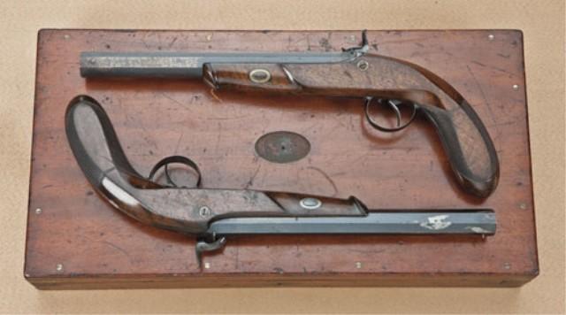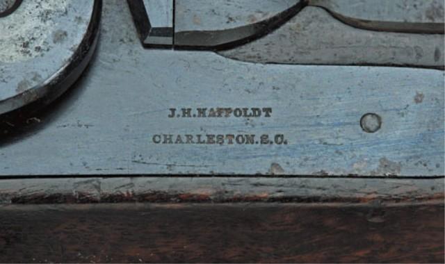 Pair of cased dueling/target pistols by J. H. Happoldt, Charleston South Carolina. With medium to heavy weight octagon barrels, measuring 9-1/2” in length, pistols 15-3/4” overall of .45 caliber smoothbore. The pair are half stocked in good quality walnut with typical Happoldt checkering flattened sides. The pistols show plain mounts, adjustable set triggers, silver barrel key escutcheon and shield shaped plaque at wrist. The pair show a full blue finish, which was applied at time of use and approx. 50-70% remains. Areas where blue have lifted show some light erosion and pinprick pitting. The stocks are very good plus with crisp checkering. The markings are sharp, the edges are crisp. The stock show just some wear at the edges, small marks, and are a nearly exact pair. The case contains correct mold, period flask, rods, mallet, small accessories. The case is lined in green baize or felt and shows some wear at contact points and fraying at the edges and is generally good. The exterior of the case is a veneered hardwood with brass screws and fittings and is also good with some scratches, mars, normal aging. The owner’s plaque in lid has been removed. A very desirable and well-known