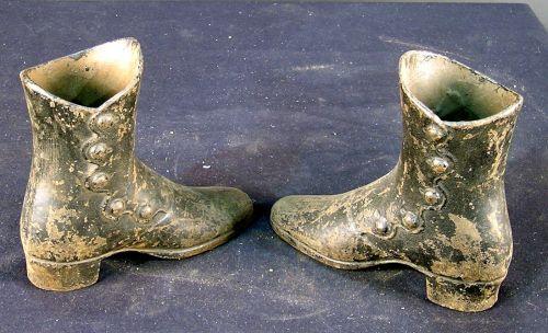 Pair of cast-iron ladies, button hook type shoes from a store display