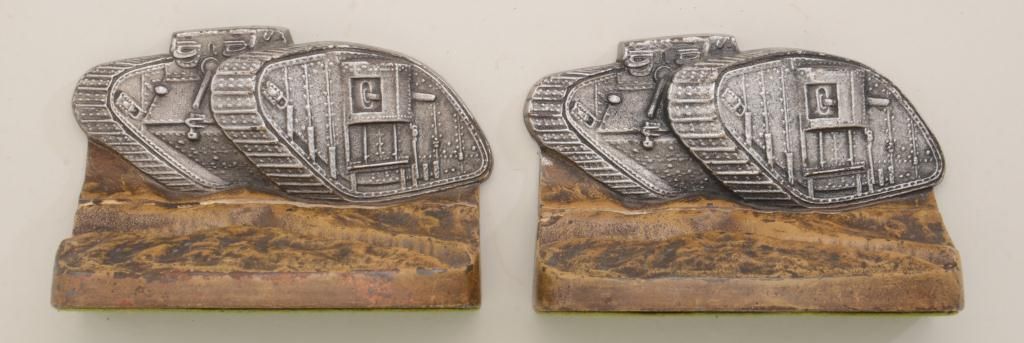 Pair of cast metal bookends, circa WWI, painted poly-chrome, showing early tanks on battlefield. Good condition, 80-90% paint. Est.: $125-$250