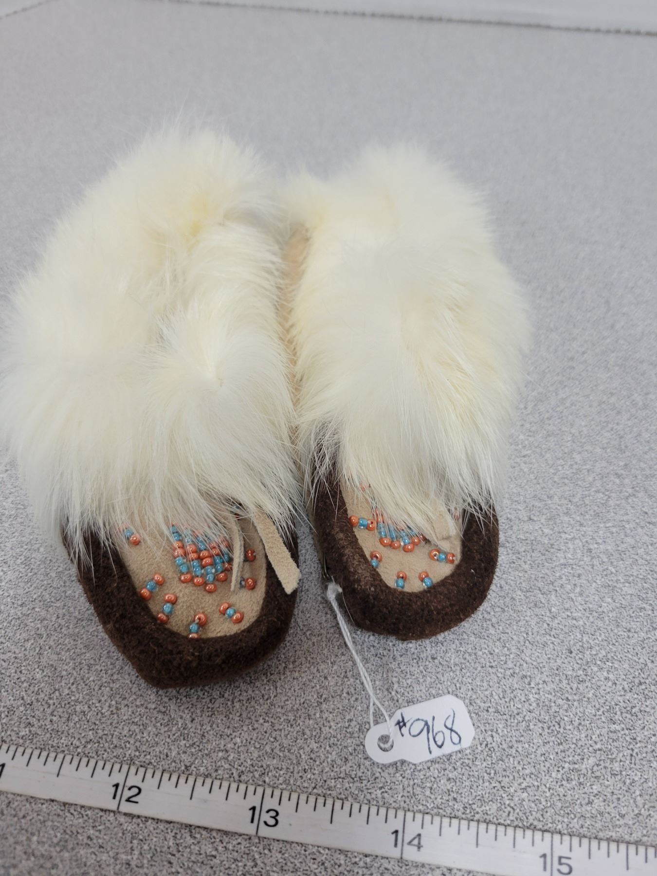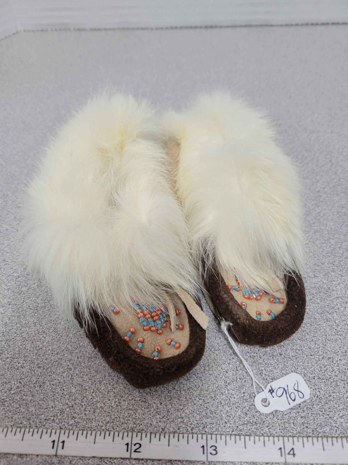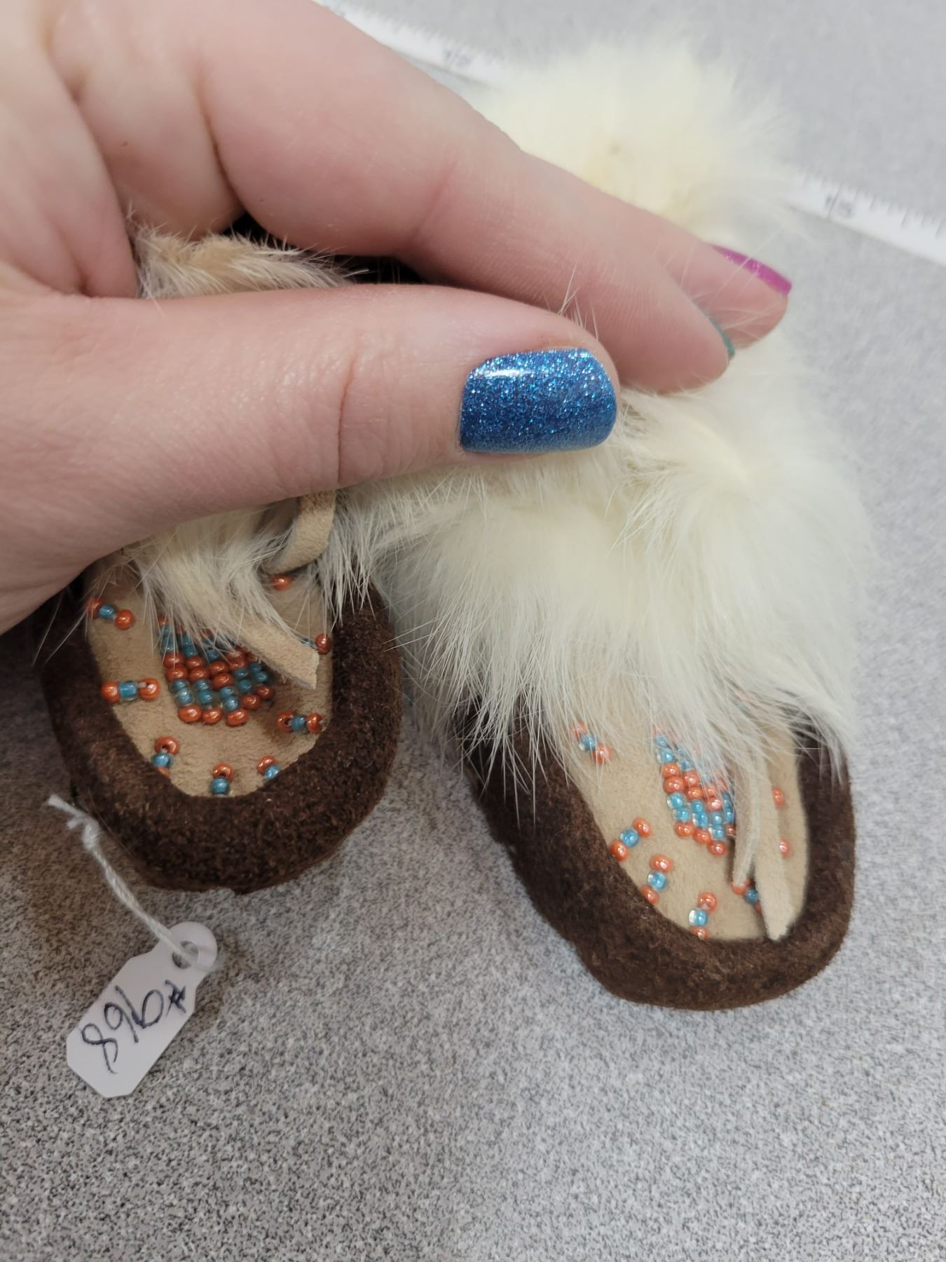 Pair of child’s moccasins, beaded and rabbit trim, size 3-4