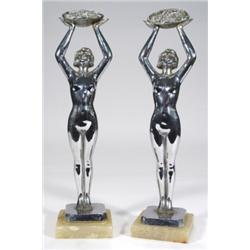 Pair of chrome Art Deco style maidens clutching baskets of flowers on onyx bases, impressed Limousin to bases, 36cm high