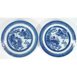 Pair of circular Chinese blue and white porcelain plates, hand painted with willow pattern, 26cm …