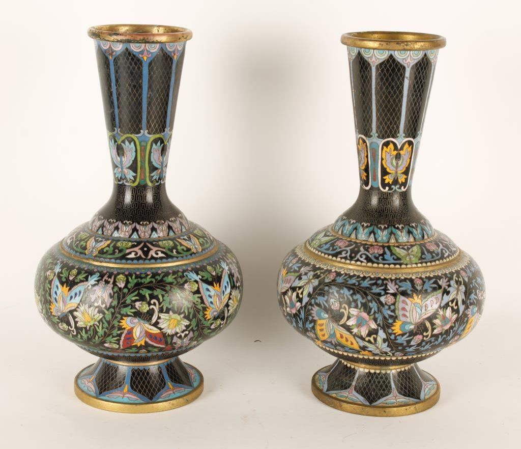 Pair of cloisonné vases with butterflies, bats and fines with black background, each approximately 12” in height and 8” in diameter at the 13.5”widest points. Est.: $400-$800.