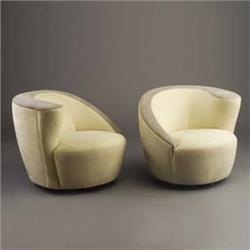 Pair of club chairs in the style of Vladimir Kagan, each with stylized "apostrophe" frame fully-upholstered in beige and gray suede, on a swivel base. Minor staining, a few small punctures. Unmarked. 30" x 36" dia. $300-500