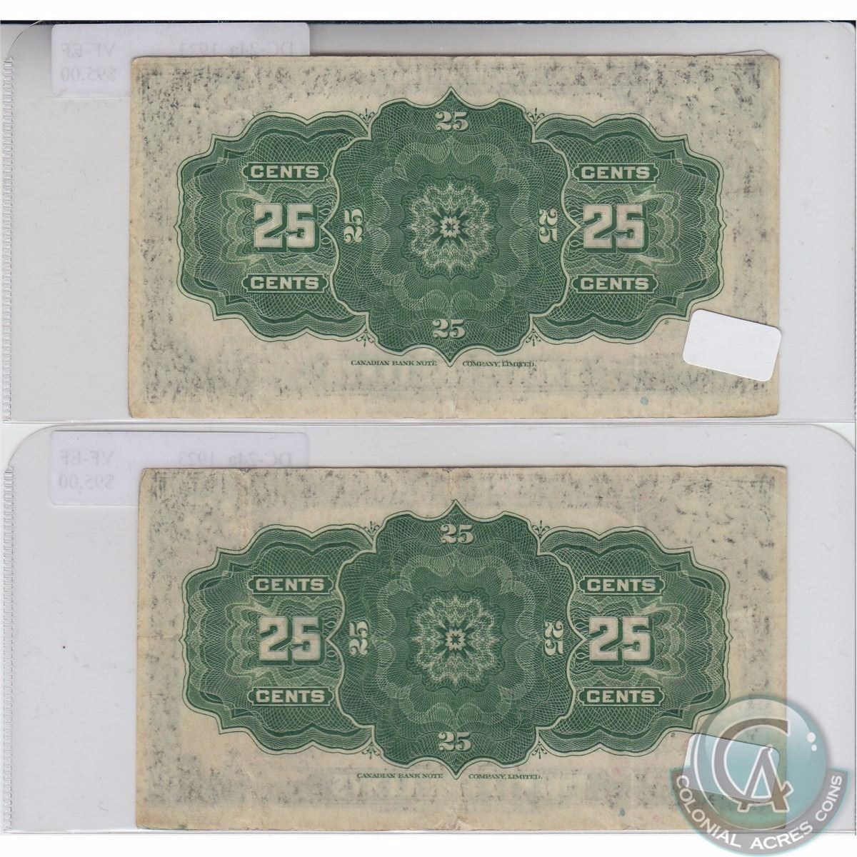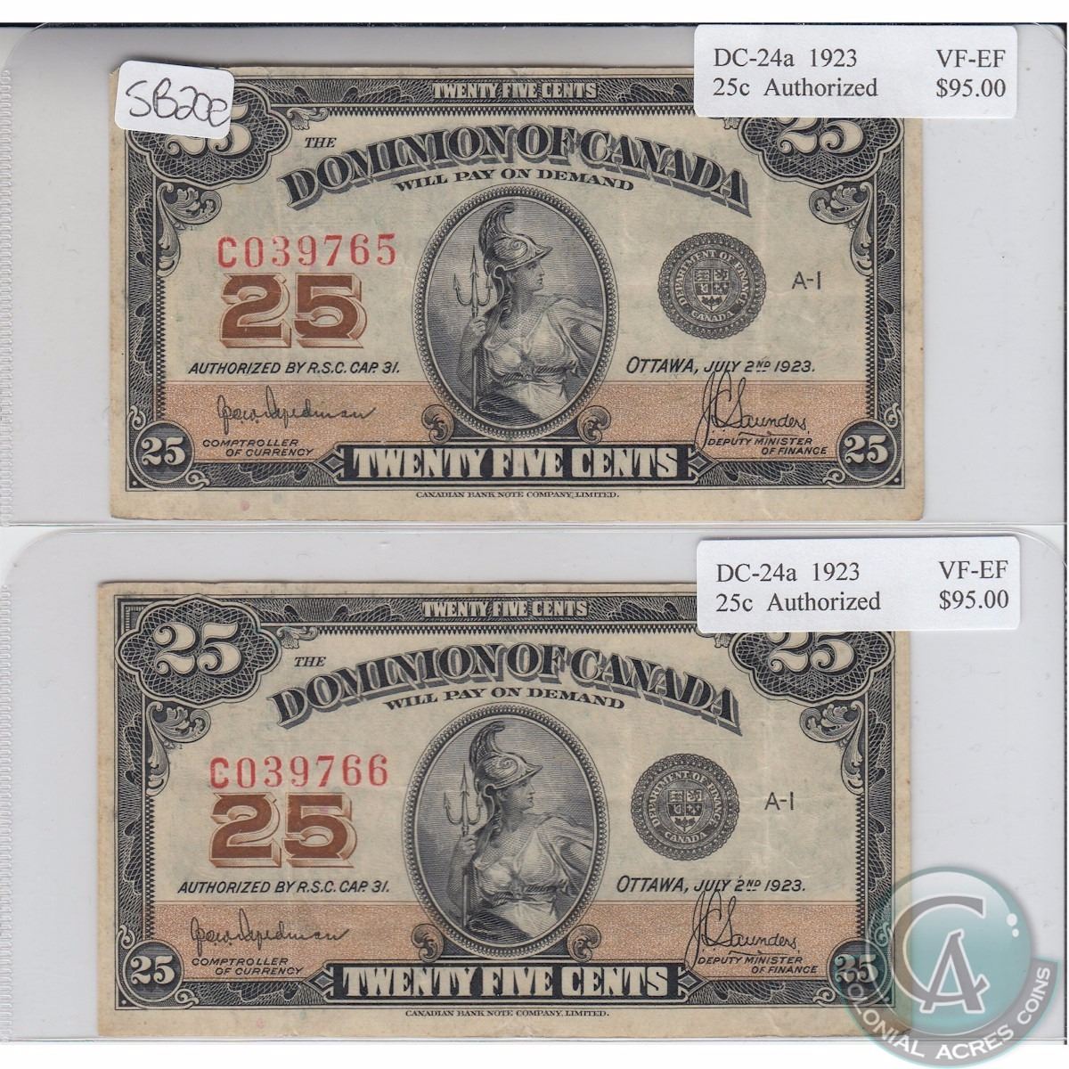 Pair of consecutive 1923 25c notes VF-EF Condition. DC-24a, Hyndman-Saunders, AUTHORIZED, S/N:C039765/C039766. 2pcs