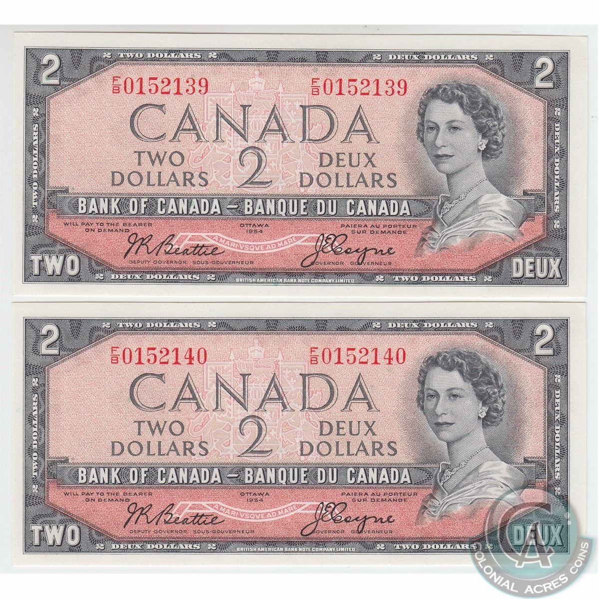 Pair of consecutive Bank of Canada 1954 Devil's Face $2 Choice UNC. BC-30b, Beattie-Coyne, S/N: F/B0152139/0152140. Both notes are well centered and original.