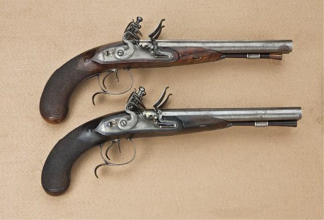 Pair of double-barrel flintlock pistols with original detachable shoulder stock, signed “Innes Maker to His Majesty, Edinburgh” on barrel in very good original condition. Approx. 15” overall with 8-3/4” barrels, of .54 caliber smoothbore, half stocked in select walnut, checkered grip. The pair show a light grey to brown patina on barrels with faint traces of original brown and striping. The locks show case hardening drifting to grey with some slight colors mixed in. The triggerguards show 75-85% original blue and the tang and small parts show original color. The pistols are very fine quality with double gold bands at breech, gold lined touched holes and quality engraving throughout. The stocks are good to very good with just some slight darkening with handling and age, a few minor imperfections, at least very good overall with their original detachable shoulder-stocks and are like very good condition. Undoubtedly Innes was referring to the duke of Edinburgh, to whom he had a royal appointment. The pair are in their original flintlock configuration with their original hammers, top jaws, screws, etc. Double barrel flintlock pairs of pistols with stocks have long been sought after