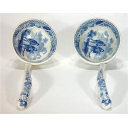 Pair of early 19th century Turner blue and white transfer printed Villager patterned pottery sauce ladles with floral handles, 20cm in length