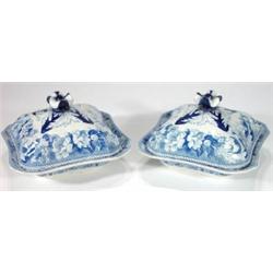 Pair of early 19th century Turner blue and white transfer printed Villager patterned pottery vegetable dishes and covers with floral handles, 23cm in length